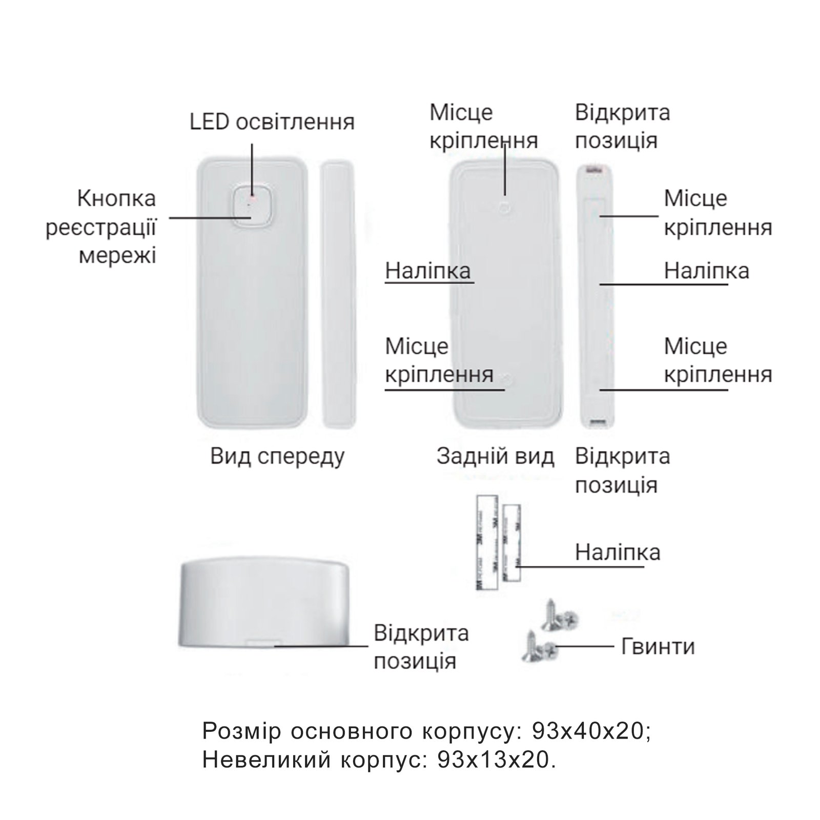 Вага нетто, кг:0,08;Габаритні розміри виробу (ШхГхВ), мм:93х40х20, 93х13х20.;Гарантія:12 місяців;Країна виробник:Китай;Програмний інтерфейс:TUYA Smart / Smart Life;Радіус дії, м:до 50 м;Тип виробу:Бездротовий датчик без дисплея