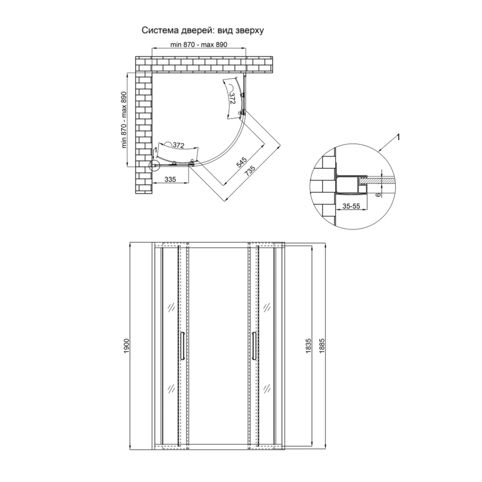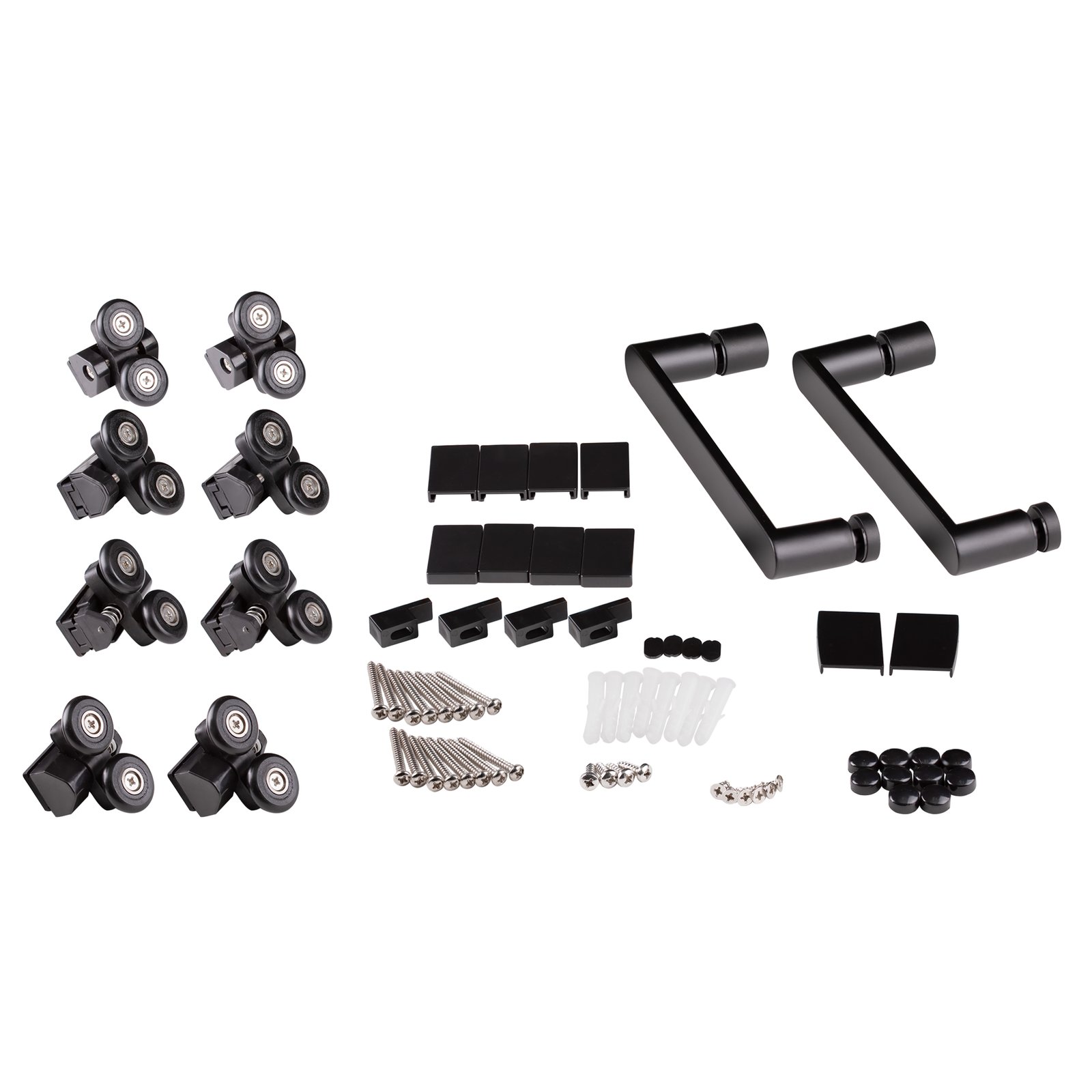 Подвійні ролики, ручки, верхній профіль, нижній профіль, бічні профілі, набір ущільнювачів, розширювальні профілі, 2 скляні двері, 2 глухі скла, комплект кріплень, заглушки, елементи, що з'єднують, фіксатори.