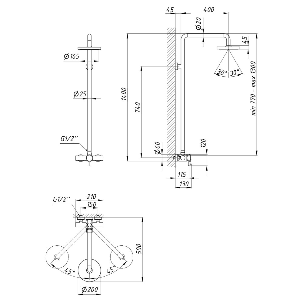 Висота душової стійки, мм
