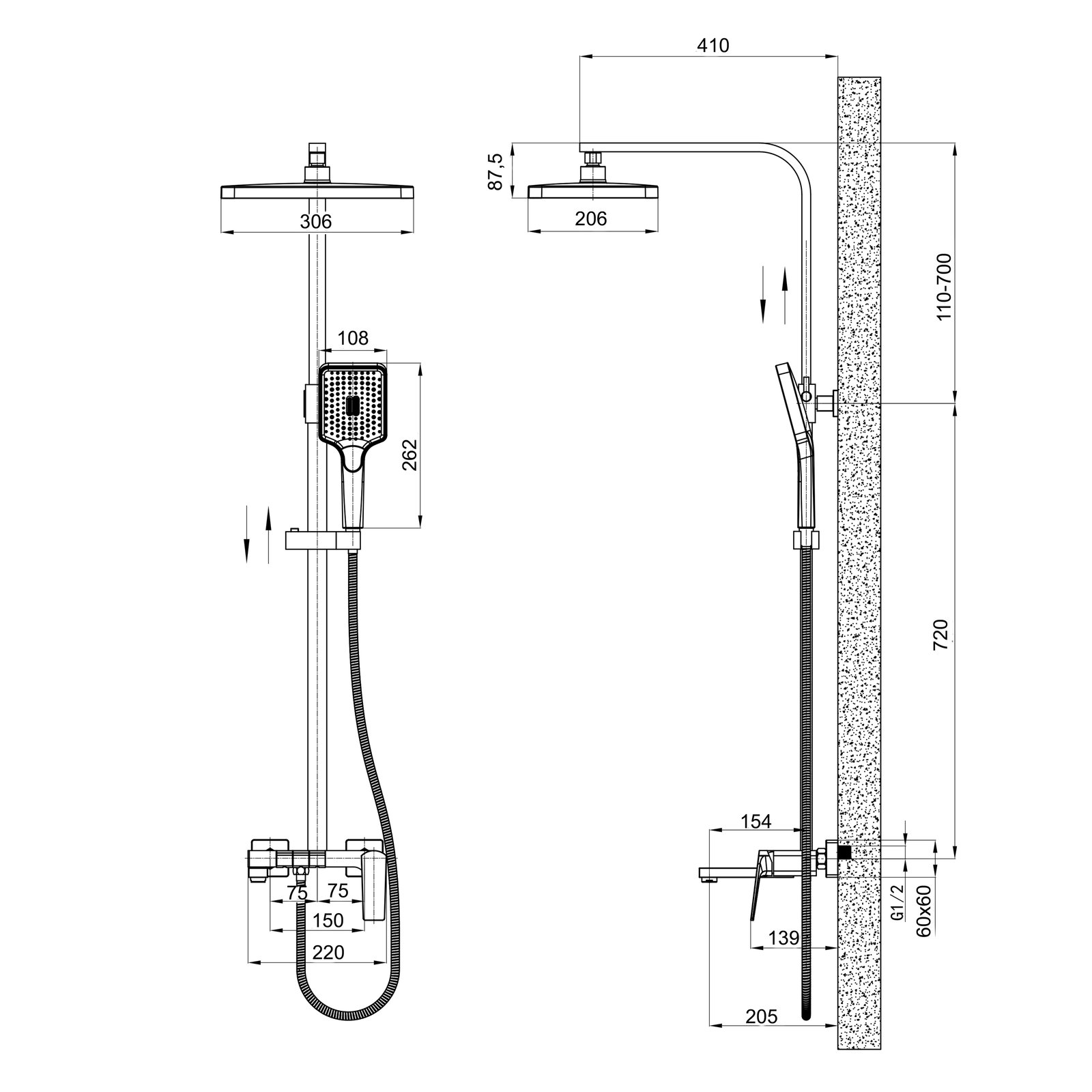 Ручний душ: 150х110. Верхній душ: 300х200
