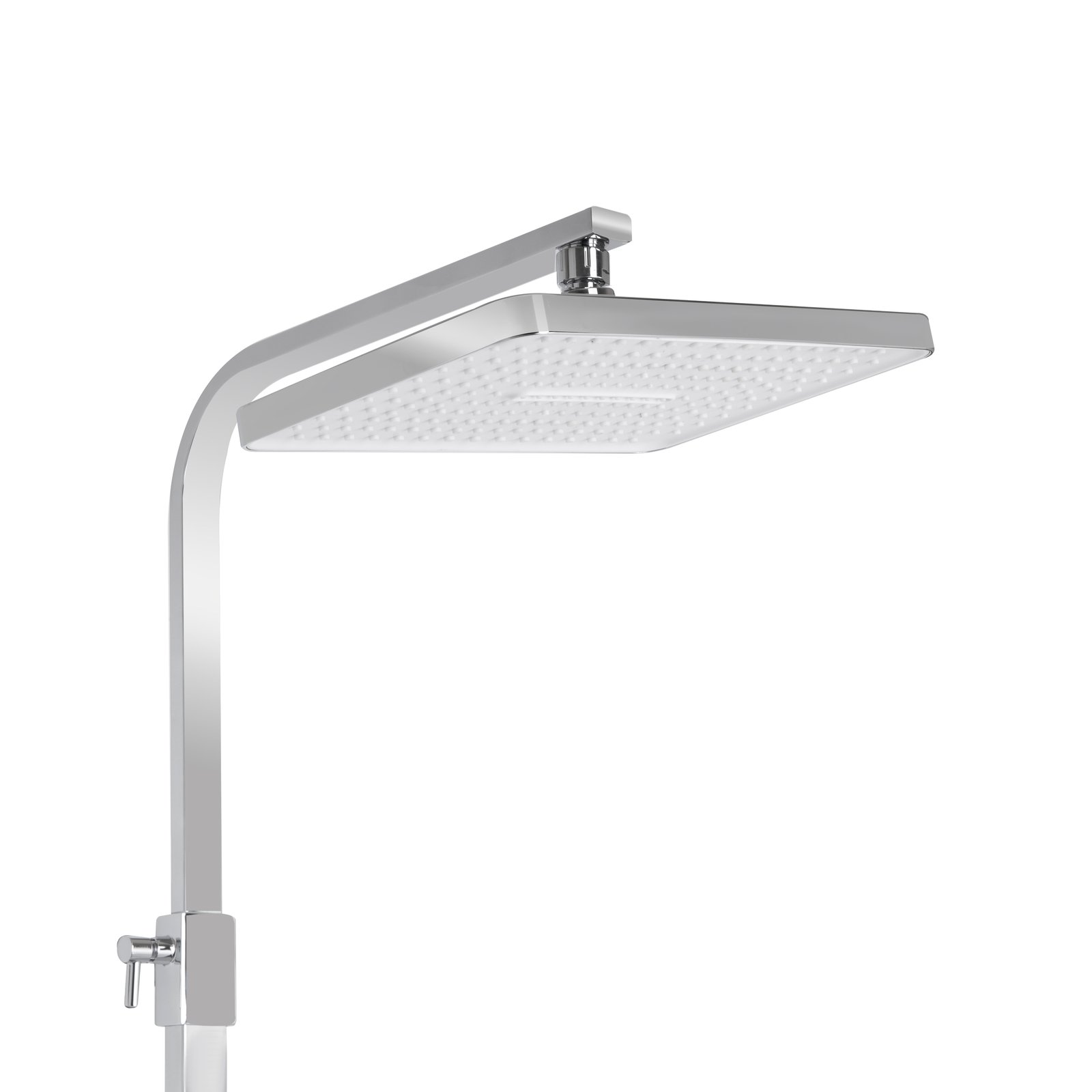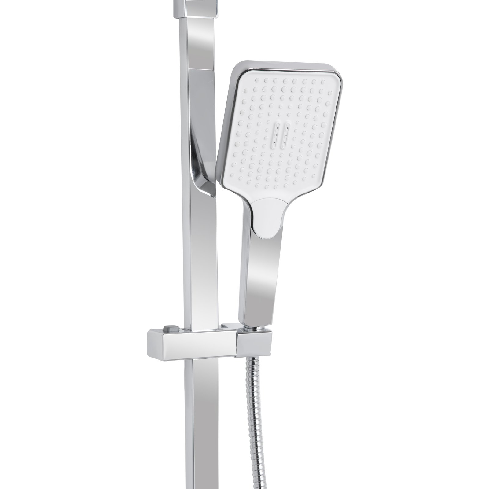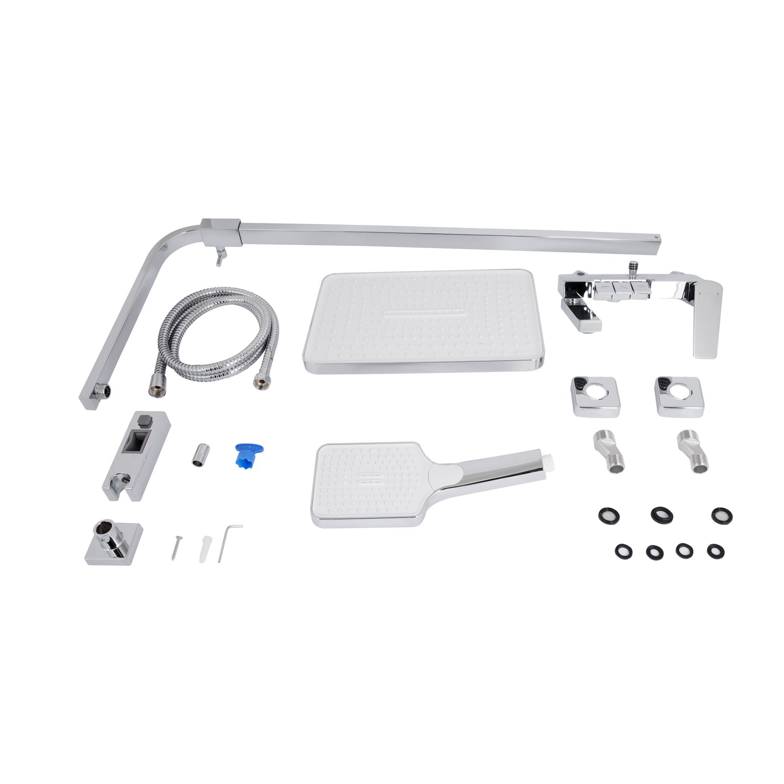 Настінний змішувач із перемикачем, верхній душ квадратної форми, ручна лійка, душовий шланг, штанга з регульованим тримачем для лійки, кріпильні елементи та ущільнювальні кільця.