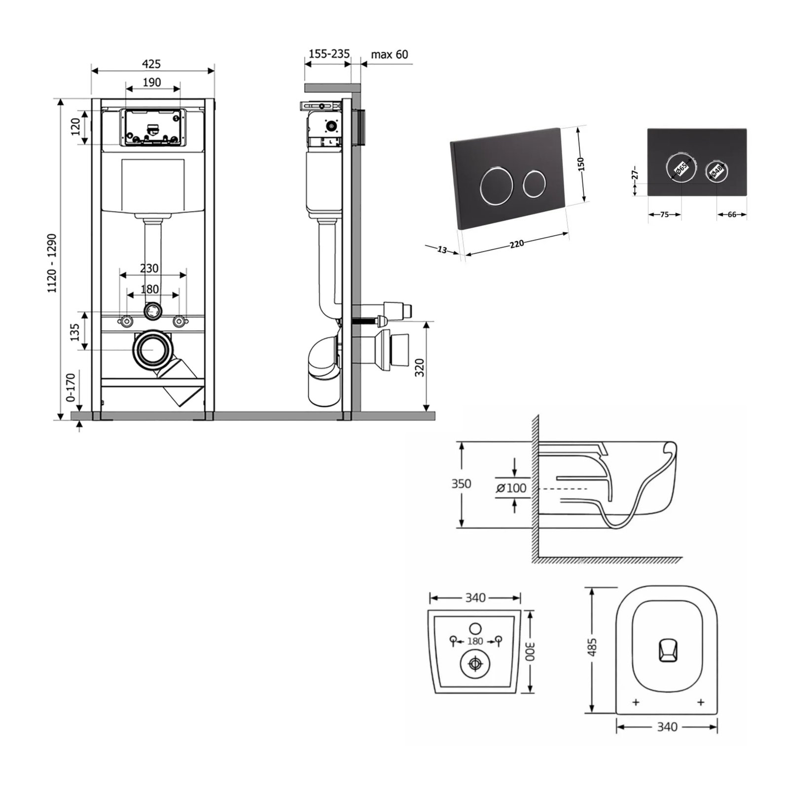 Унітаз: 485х340х350. Інсталяція: 425х185х1280. Панель змиву: 220х13х150.