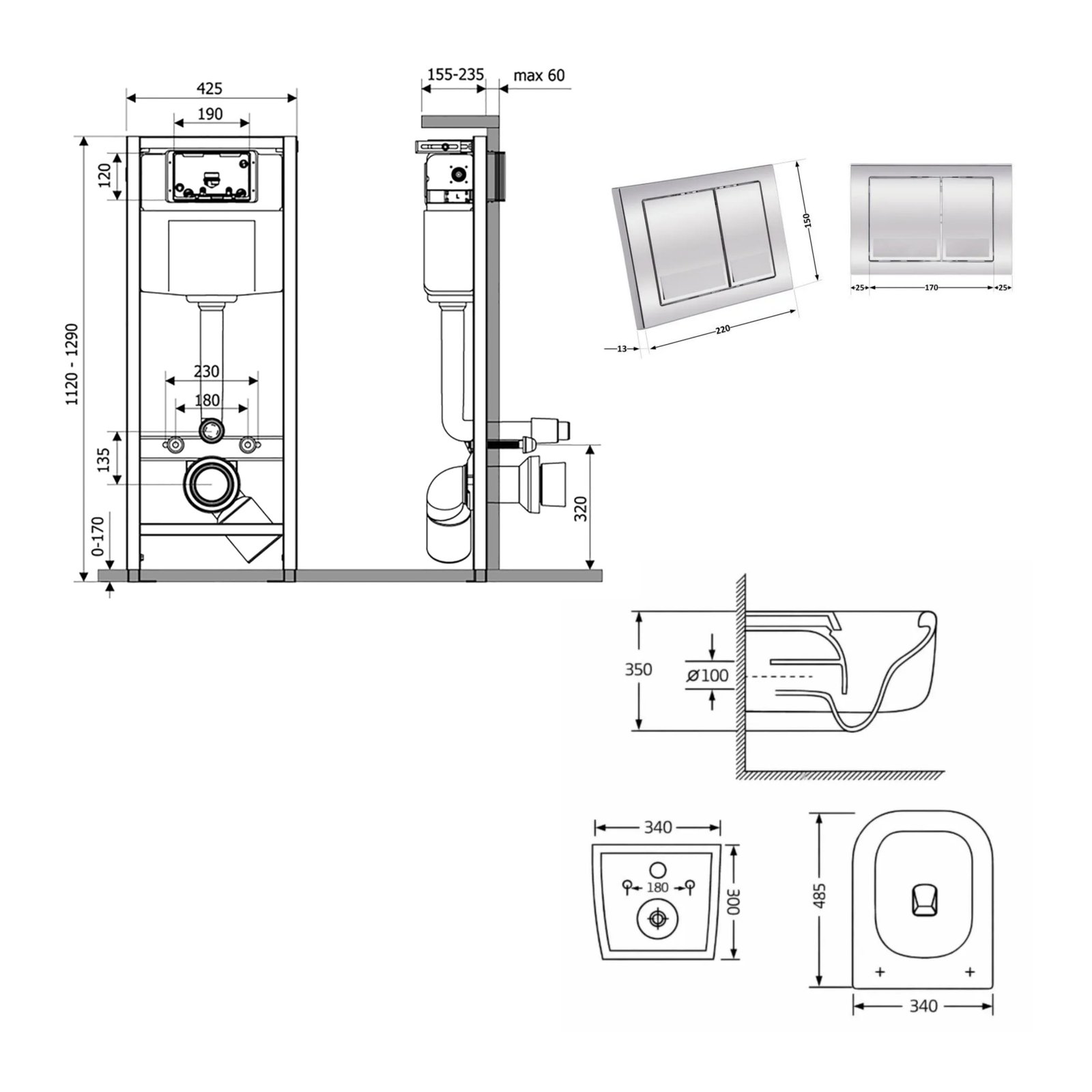 Унітаз: 485х340х350. Інсталяція: 425х185х1280. Панель змиву: 220х13х150.