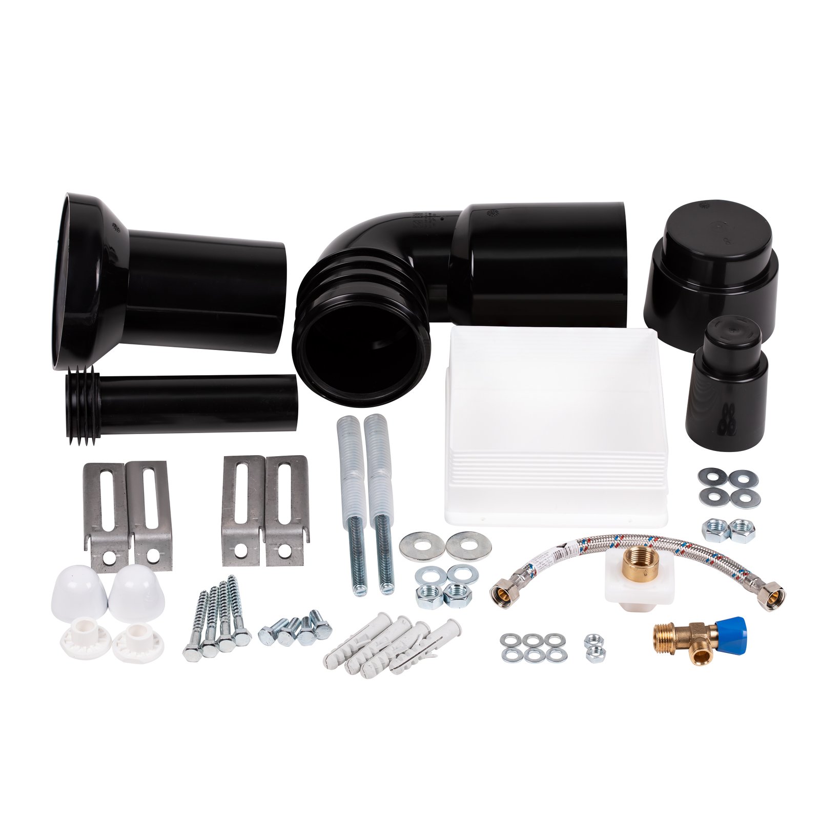 Інсталяція, звукоізоляційна прокладка, комплект підведення води, 2 болти-тримачі для унітаза, вихідна труба для унітаза, кріпильні деталі.
