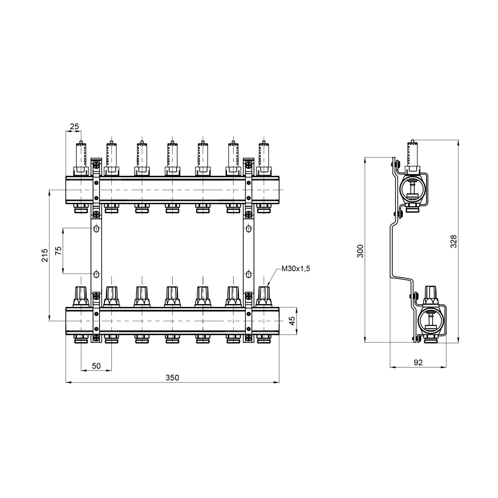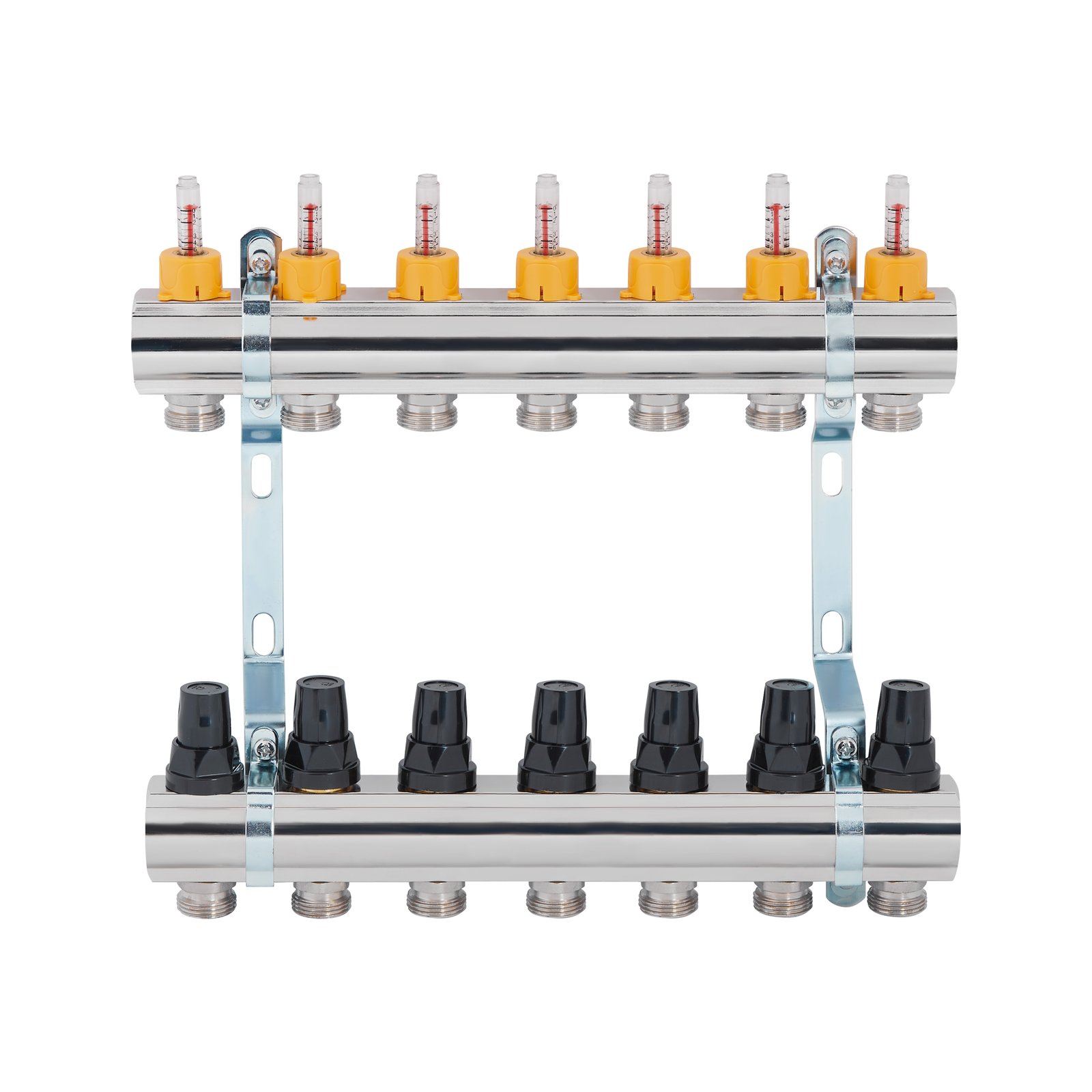 Колектор з витратомірами SD Forte 1" на 7 виходів зібраний на двох кронштейнах, які необхідні для кріплення до стіни або в колекторній шафі. Лінія подачі обладнана витратомірами, на зворотній балці встановлено термоклапани. Розмір під’єднань сервоприводів (не входять в комплектацію) — 30х1,5. Максимальна температура теплоносія на вході в колектор — 95 °C. Тиск в системі не повинен перевищувати 4 бари. Функція виробу — рівномірний розподіл тепла в петлях теплої підлоги.
