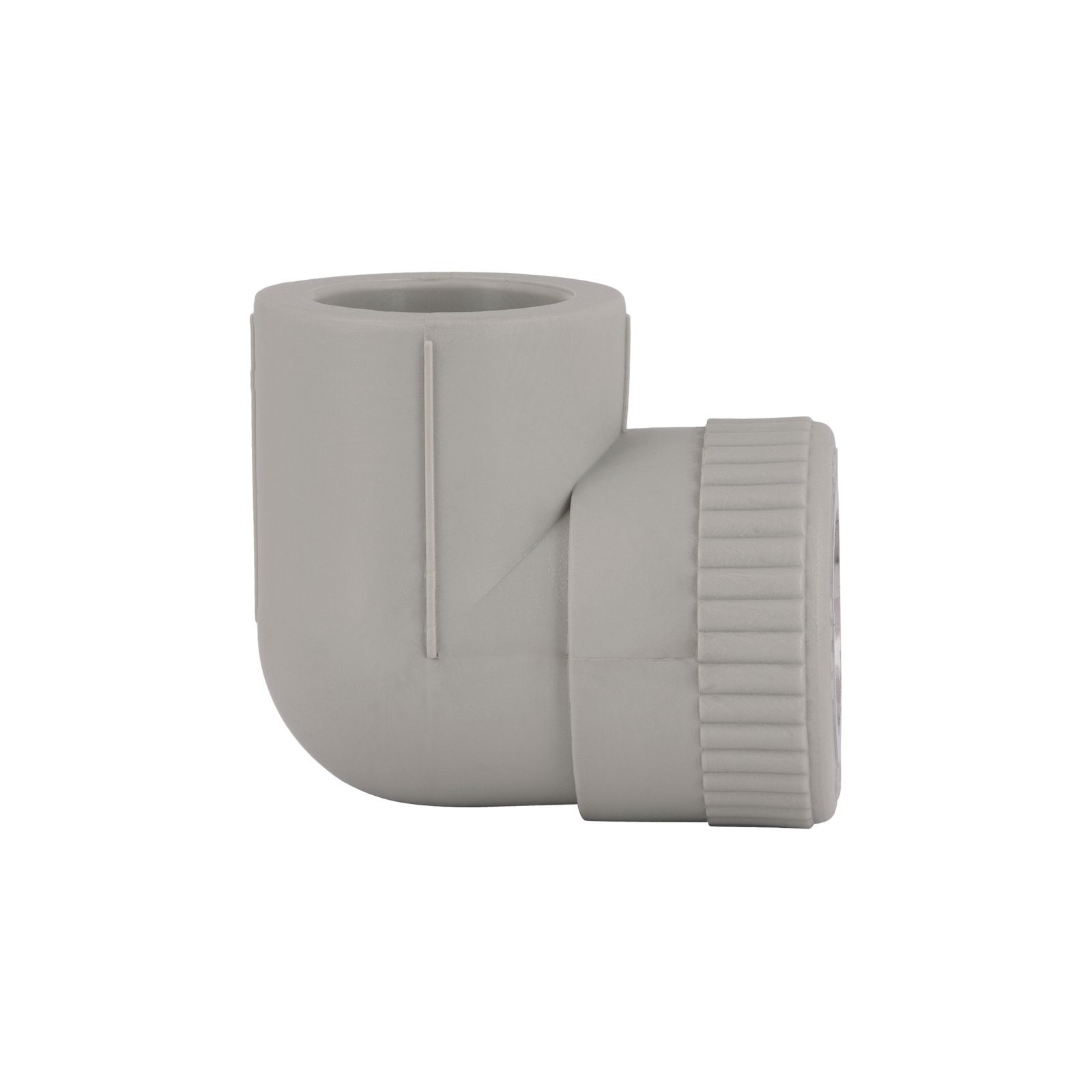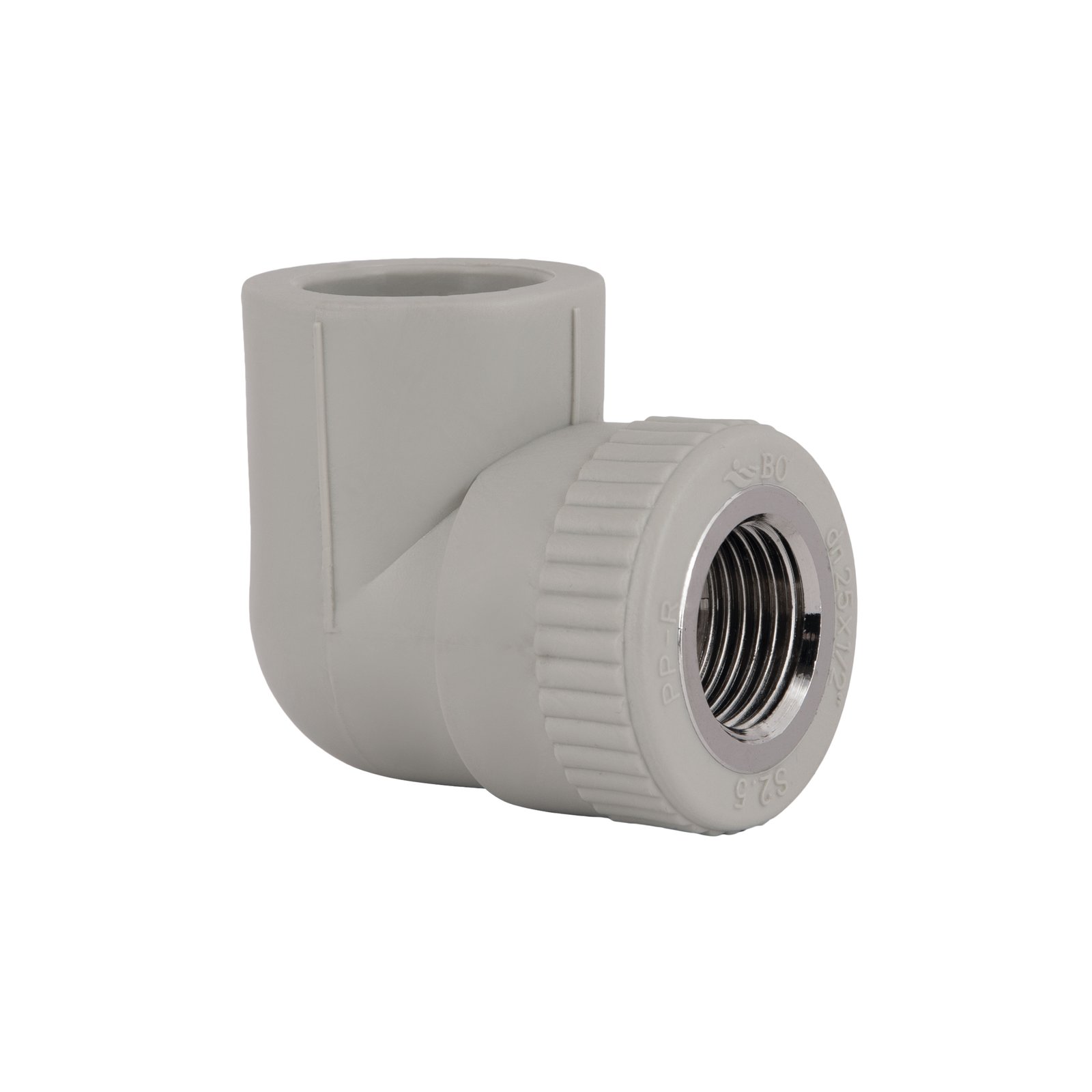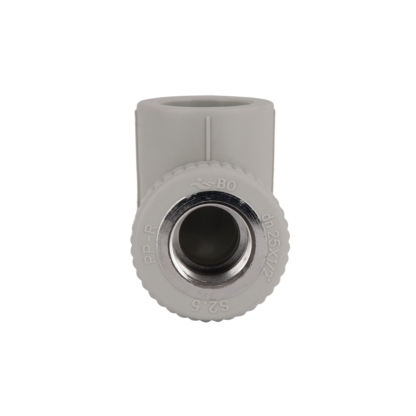 Кутник PPR Blue Ocean 25х1/2", 90° ВР виготовлений з якісного поліпропілену з переходом на внутрішнє латунне різьблення. У разі, якщо необхідно змінити напрямок основної труби під кутом 90° або приєднати до неї окремий елемент інженерної системи з різьбовим підключенням, використовують даний фітінг. Діаметр підключення становить 25 мм, а діаметр різьблення 1/2".