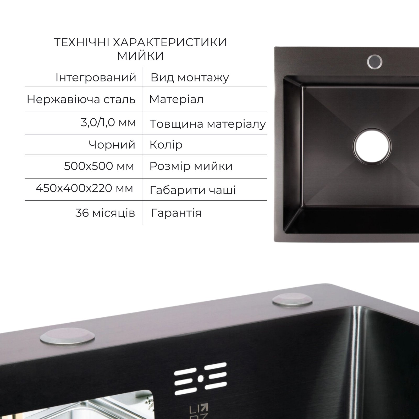 Комплект Lidz Handmade H5050B (BlackPVD) пропонує мийку з вишуканим чорним покриттям BlackPVD, доповнену дозатором і стильним кошиком Lidz K01B. Це сучасне рішення для стильних кухонь.