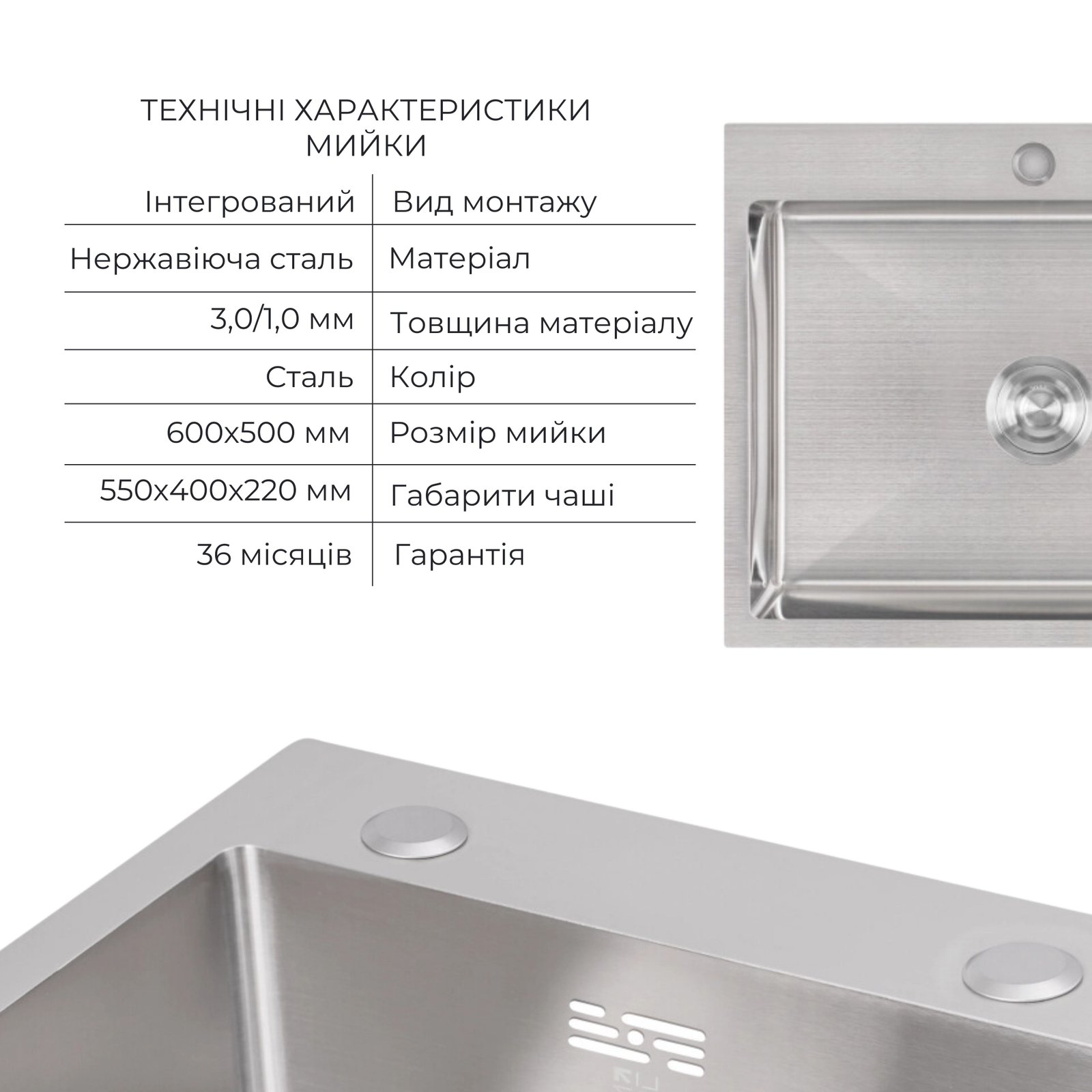 Комплект Lidz Handmade H6050 (Brushed) включає простору мийку зі шліфованою поверхнею Brushed, доповнену вбудованим дозатором і універсальним кошиком Lidz K01G. Надійне і практичне рішення для будь-якої кухні.