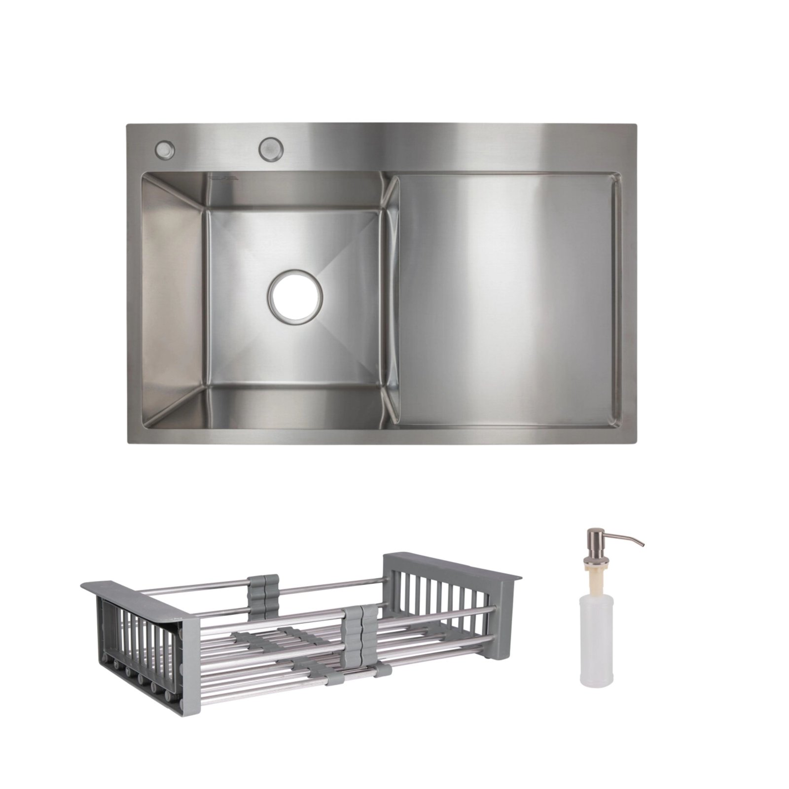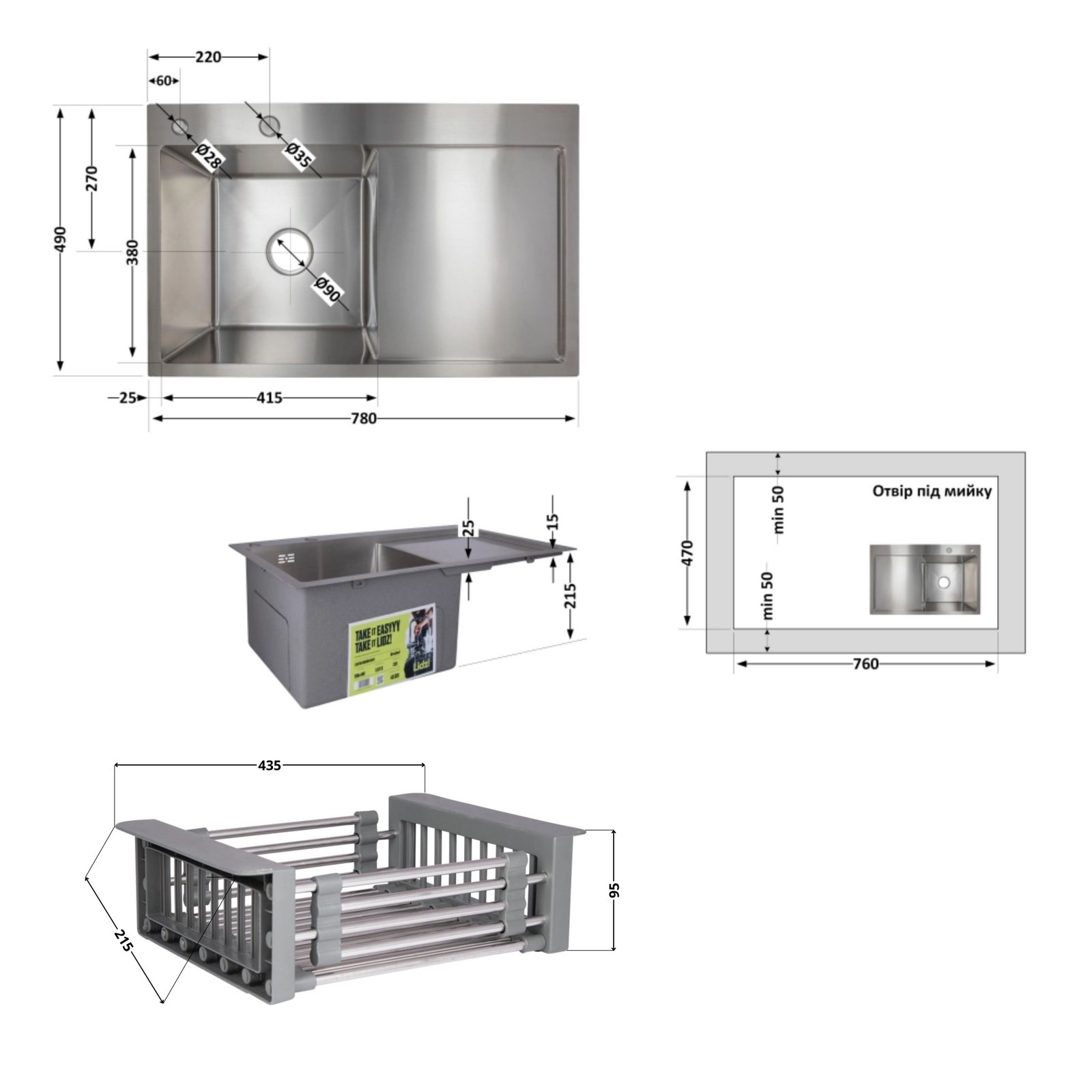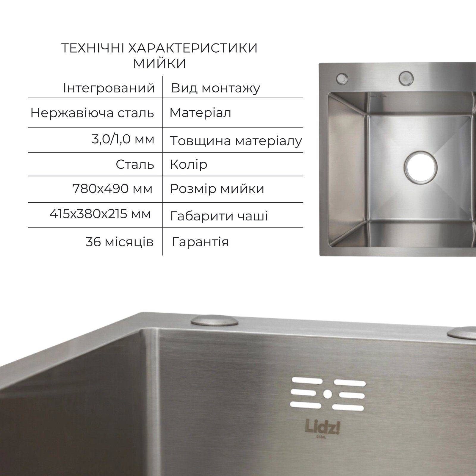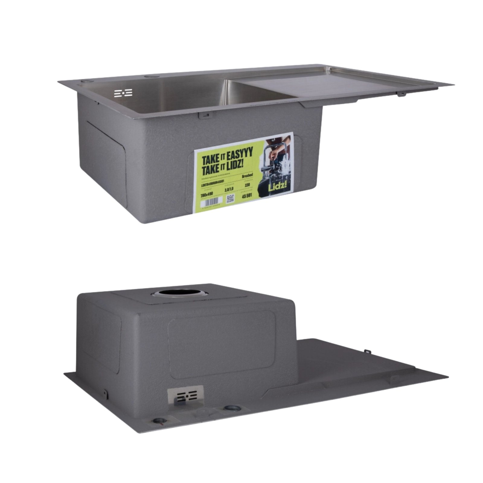 У наборі передбачено все необхідне: дозатор для мила та сталевий кошик Lidz K01G. Наявність широкого правого крила дозволяє захистити стільницю від вологи та зручно розмістити вимитий посуд.