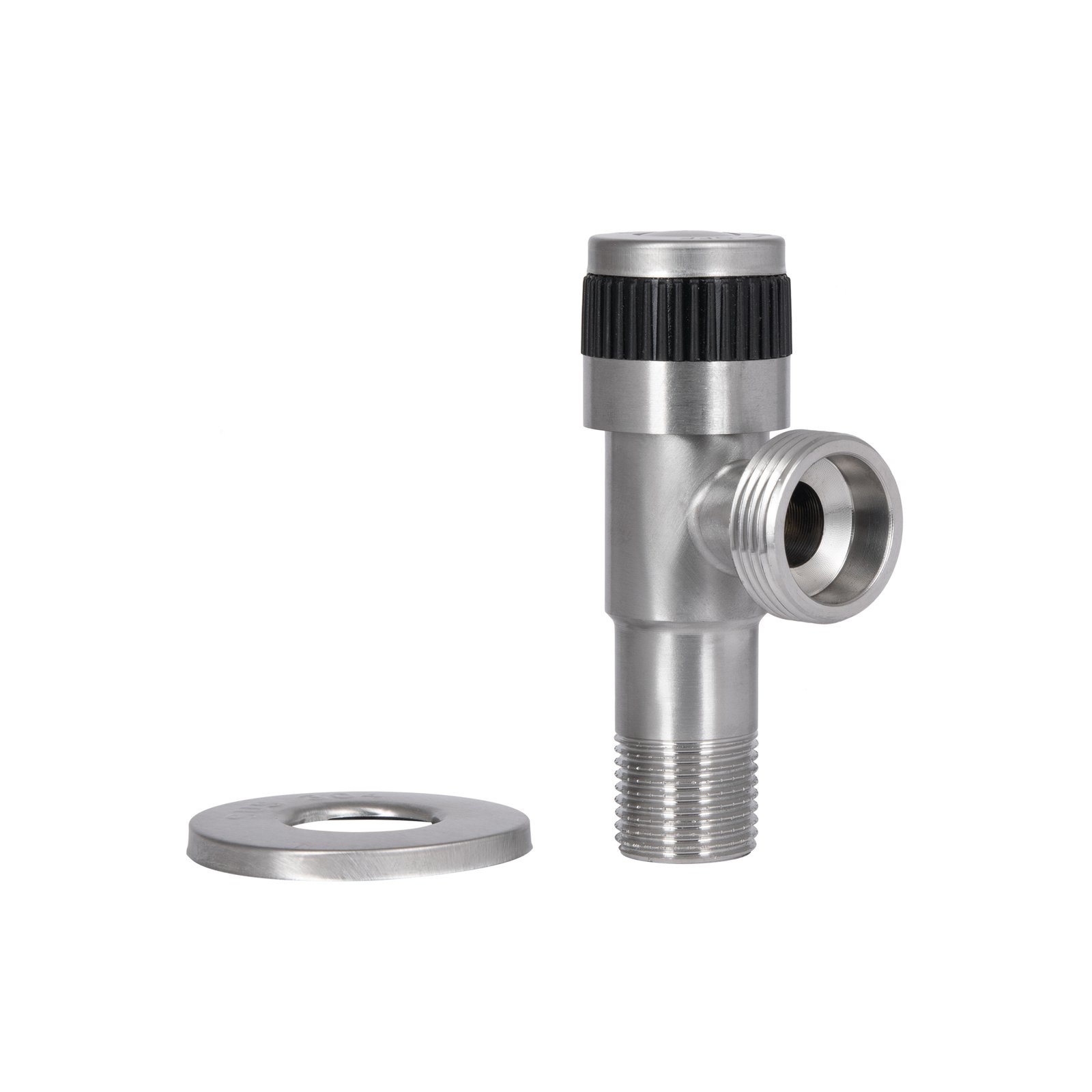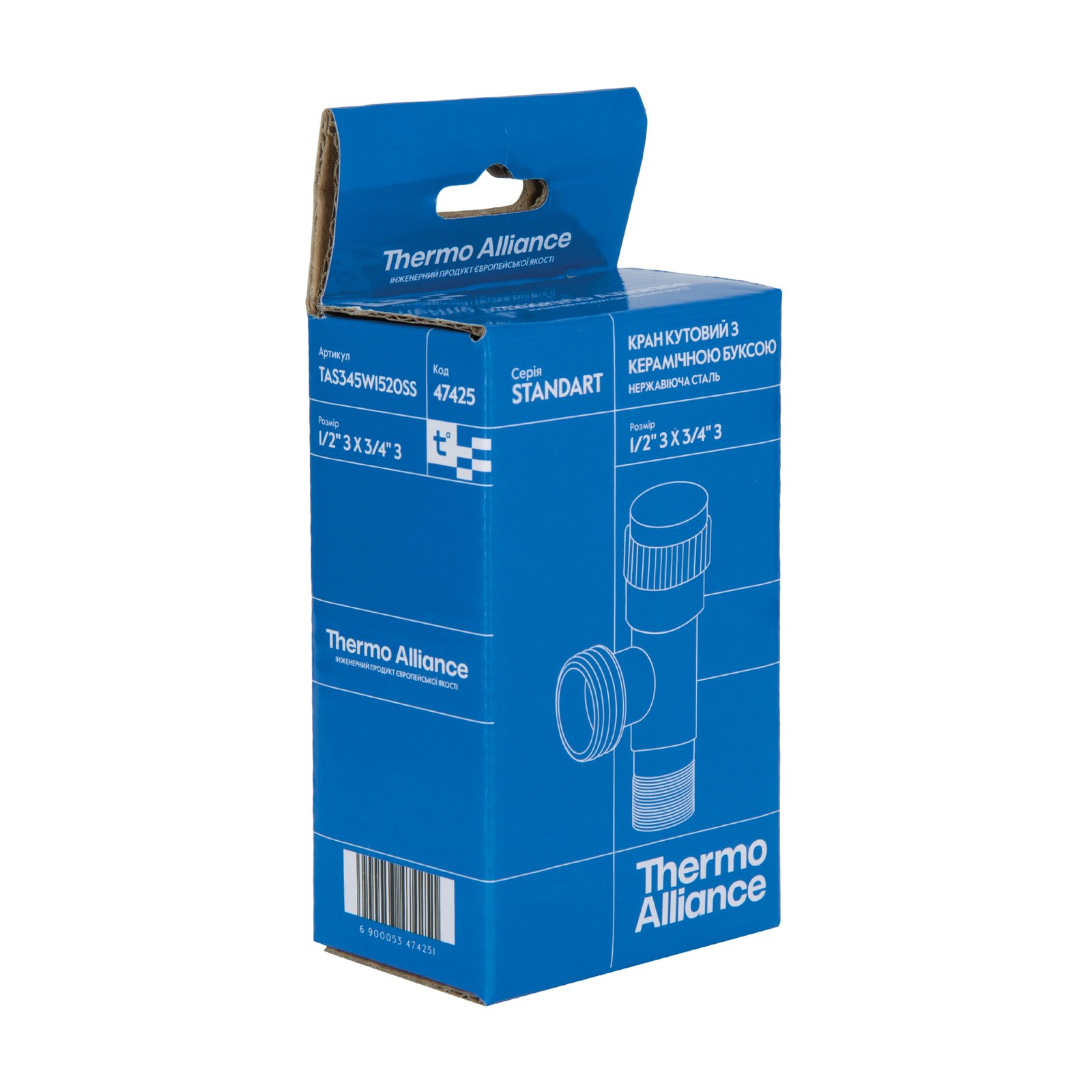 Кутовий кран Thermo Alliance Standart 1/2"З х 3/4"З із нержавіючої сталі з керамічною буксою (арт. TAS345W1520SS) - надійне та практичне рішення для підключення сантехнічних приладів і організації подачі води. Корпус із міцної нержавіючої сталі забезпечує тривалий термін служби та стійкість до корозії, а керамічна букса гарантує плавне й точне керування потоком без протікань.