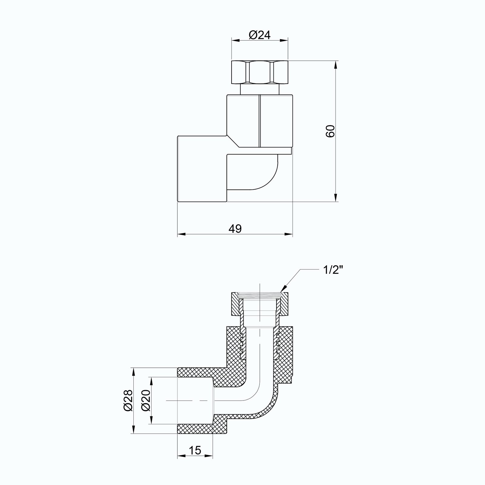 Кутик PPR Thermo Alliance з накидною гайкою 20х1/2" ВР — комбінований виріб, призначений для під'єднання різних пристроїв, виконання різьбових з'єднань з поліпропіленовим трубах під прямим кутом. Матеріали виготовлення фасонної деталі — поліпропілен і латунь. Діаметр підключення під поліфузну пайку — 20 мм (внутрішній), нарізь — 1/2". Правила експлуатації задають температуру робочого середовища до 90 °С, PN 25.