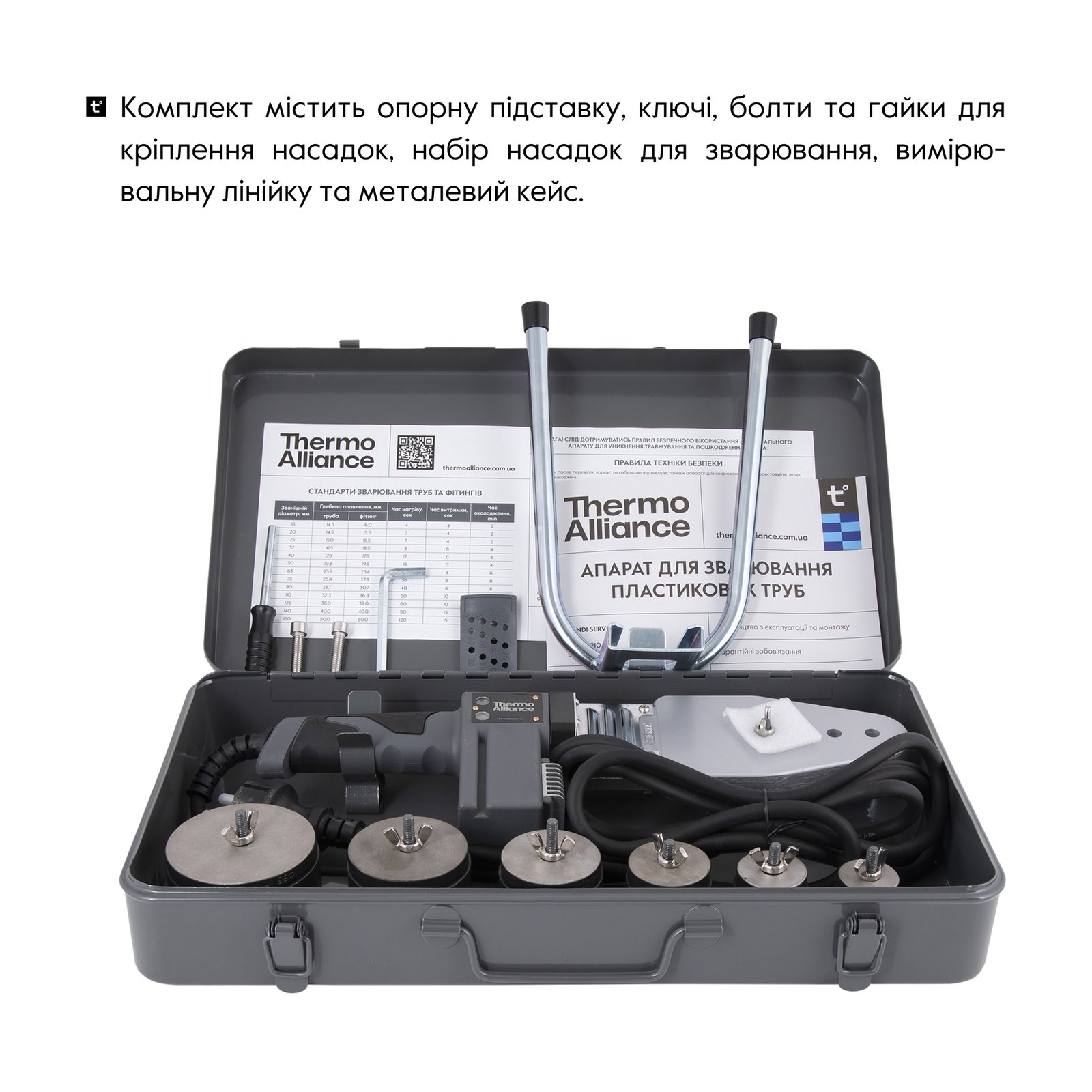Thermo Alliance STD-103 Паяльник для PPR Ø20-63 (автоматичний), 800W розроблений для роботи з трубами більшого діаметра – від 20 до 63 мм. Потужний нагрівач на 800 Вт гарантує швидке та рівномірне нагрівання, що особливо важливо при паянні труб великого діаметру. Автоматична система керування полегшує налаштування та контроль температури, що мінімізує ризик неправильних з'єднань.