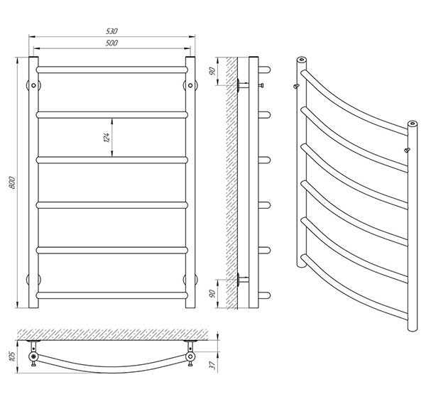 Рушникосушарка - 1 шт, кріплення (шуруп оцинкований з дюбелем, п'ятак, втулка, штифт, стійка) - 4 шт, кран Маєвського 1/2 " - 1 шт, заглушка різьбова 1/2 " - 2 шт, ковпачок декоративний - 2 шт, ключ шестигранний - 1 шт, упаковка (короб гофрокартонний, чохол поліетиленовий, чохол поліетиленовий для кріплення, короб гофрокартонний для кріплень) - 1 шт, паспорт - 1 шт.