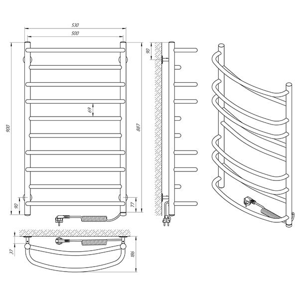 Рушникосушарка – 1 шт, кріплення (шуруп оцинкований з дюбелем, п'ятак, втулка, штифт, стійка) - 4 шт, ключ шестигранний – 1 шт, упаковка (короб картонний, чохол поліетиленовий, чохол поліетиленовий для кріплення, коробочка для кріплень) – 1 шт, паспорт – 1 шт.