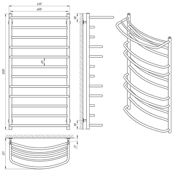 Діаметр: стійка Ø30, товщина 2 мм; перемичка Ø20, товщина 1,5 мм; стійка полки Ø20, товщина 1,5 мм; перемичка Ø14, товщина 1,5 мм