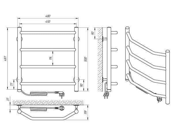 Рушникосушарка – 1 шт, кріплення (шуруп оцинкований з дюбелем, п'ятак, втулка, штифт, стійка) - 4 шт, ключ шестигранний – 1 шт, упаковка (короб картонний, чохол поліетиленовий, чохол поліетиленовий для кріплення, коробочка для кріплень) – 1 шт, паспорт – 1 шт.