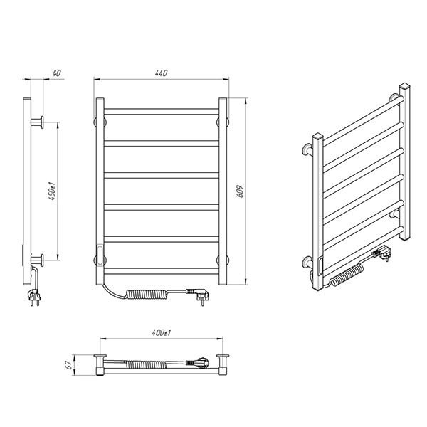 Особливості: керує нагрівом електрорушникосушарки мікропроцесорний термоконтроллер (кнопкове управління). Для початку роботи необхідно задати температуру рушникосушарки. Термодатчик контролює температуру поверхні рушникосушарки, що виключає можливість її перегріву. Серед переваг регулятора - зберігання обраного режиму роботи (при відключенні робота відновитися в запрограмованому користувачем режимі), наявність таймера відключення (3h) і колірної індикації роботи!