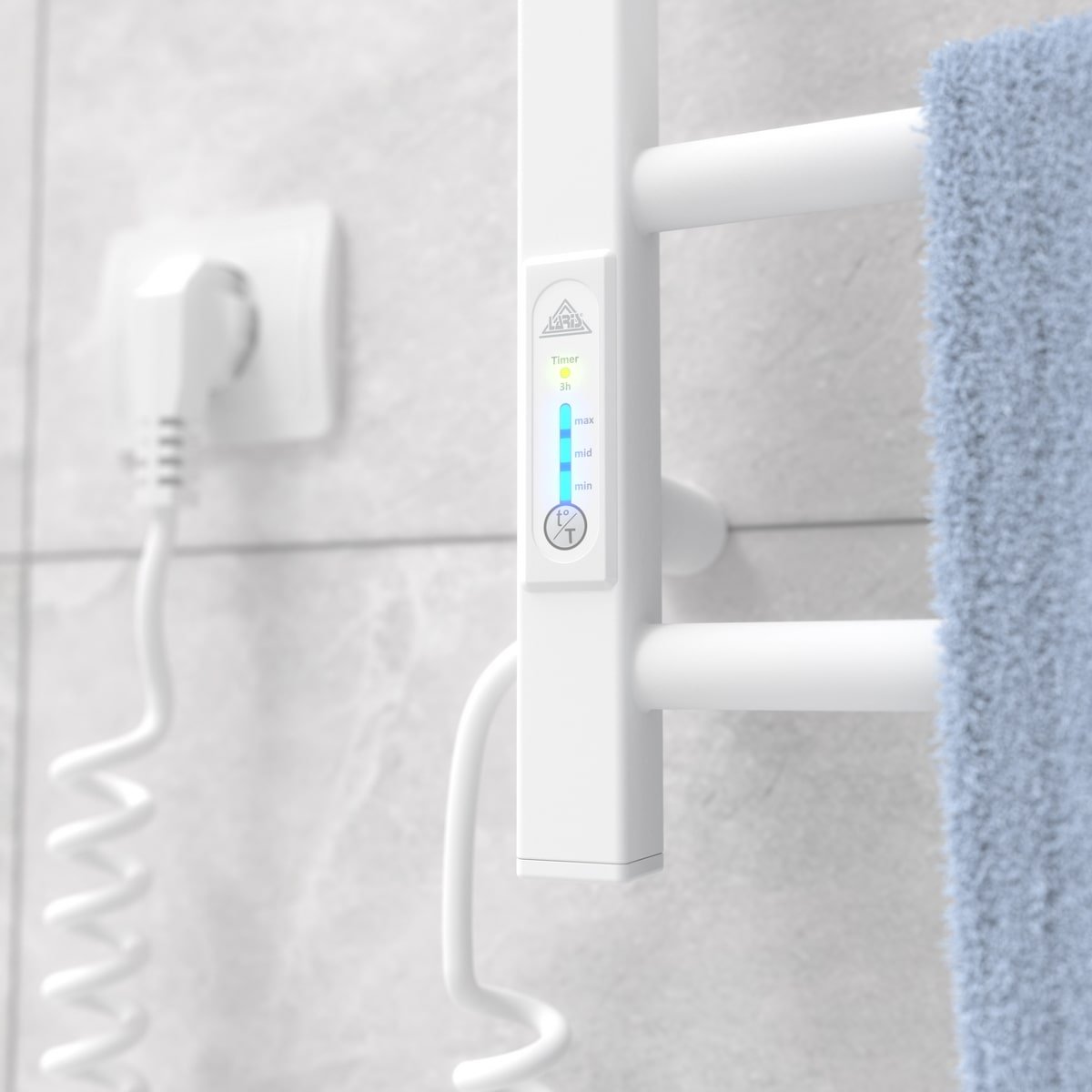 Особливості: керує нагрівом електрорушникосушарки мікропроцесорний термоконтроллер (кнопкове управління). Для початку роботи необхідно задати температуру рушникосушарки. Термодатчик контролює температуру поверхні рушникосушарки, що виключає можливість її перегріву. Серед переваг регулятора - зберігання обраного режиму роботи (при відключенні робота відновитися в запрограмованому користувачем режимі), наявність таймера відключення (3h) і колірної індикації роботи!
