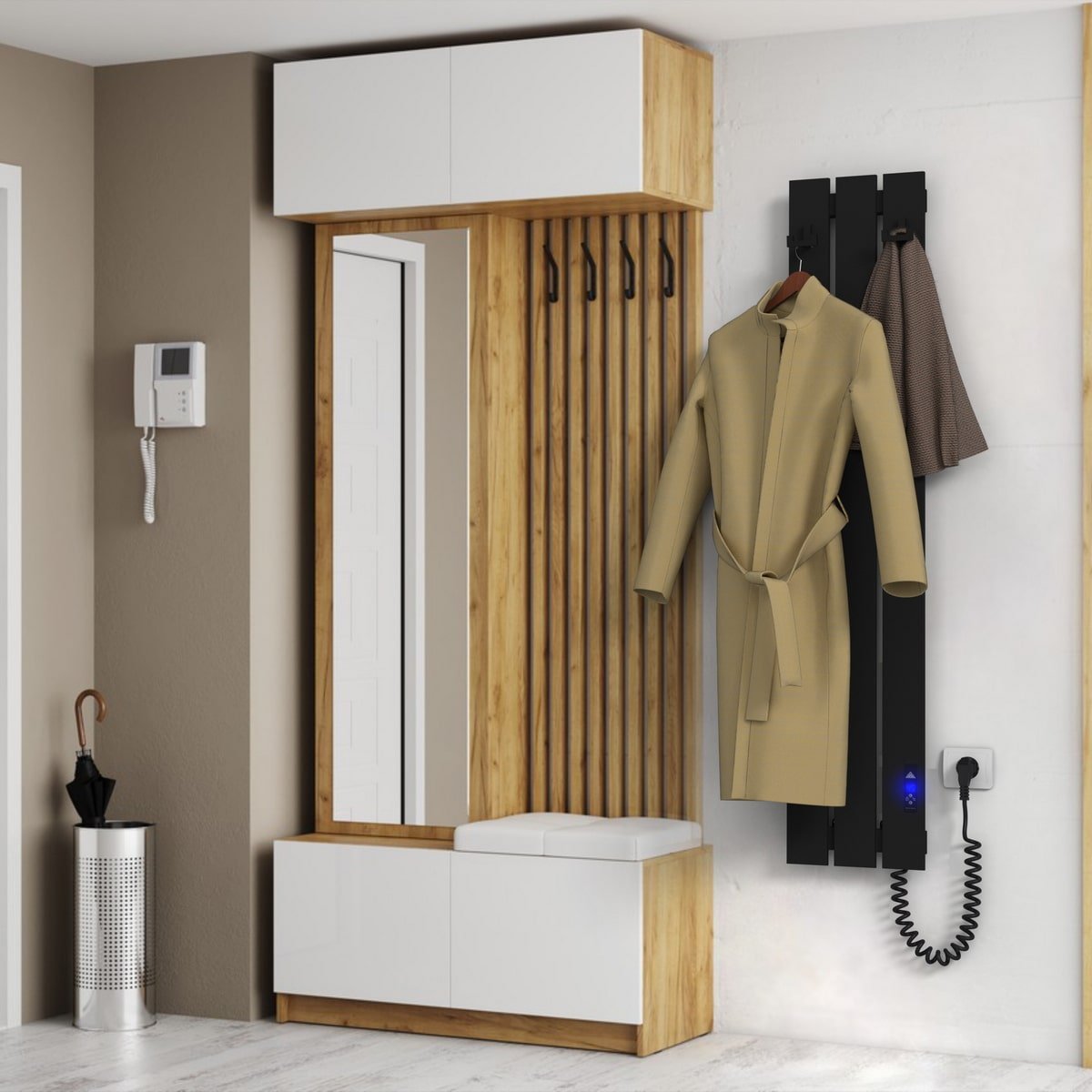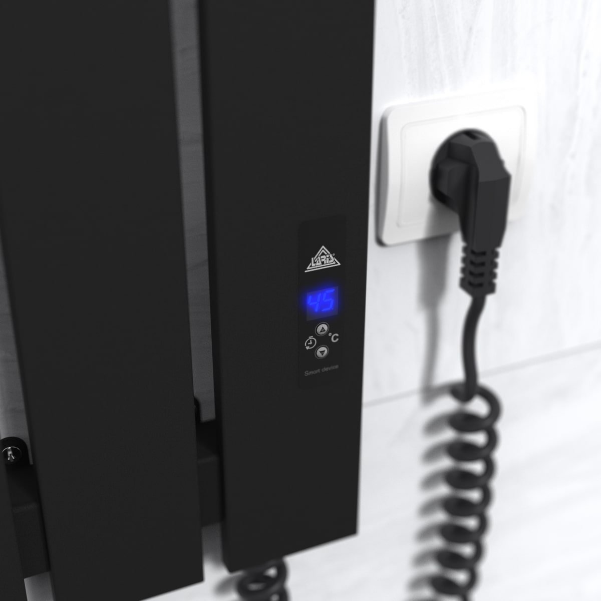 Особливості: керує нагрівом електрорушникосушарки мікропроцесорний термоконтроллер (кнопкове управління). Для початку роботи необхідно задати температуру рушникосушарки в градусах. Термодатчик контролює температуру поверхні рушникосушарки, що виключає можливість її перегріву. Серед переваг регулятора - автоматичне зниження потужності (ЕКО-режим), наявність таймера відключення (1-12h) і блокування кнопок (захист від дітей)!