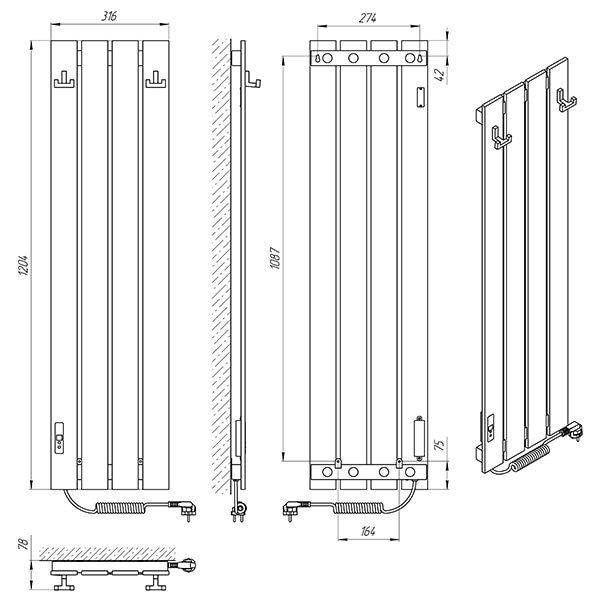 Рушникосушарка – 1 шт, кріплення (шуруп оцинкований з дюбелем) - 4 шт, гачок (WL 02) - 2 шт, гвинт М3х12 - 4 шт, ключ шестигранний – 1 шт, упаковка (короб картонний, чохол поліетиленовий, чохол поліетиленовий для кріплення, коробочка для кріплень) – 1 шт, паспорт – 1 шт.