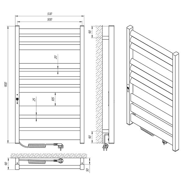 Особливості: керує нагрівом електрорушникосушарки мікропроцесорний термоконтролер. Для початку роботи необхідно задати температуру рушникосушарки. Додатково можна вмикати/вимикати нагрів, програмовано знижувати потужність до 50%. Терморегулятор контролює температуру поверхні рушникосушарки, що виключає її перегрів. Витримує напругу 1500 В перемінного току/хвилину. Є зручна функція блокування кнопок від дітей.