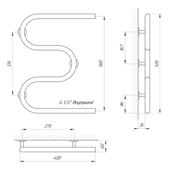 Рушникосушарка - 1 шт, кріплення (шуруп оцинкований з дюбелем, п'ятак, втулка, штифт, стійка) - 3шт, ключ шестигранний - 1 шт, упаковка (короб гофрокартонний, чохол поліетиленовий, чохол поліетиленовий для кріплення, короб гофрокартонний для кріплень) - 1 шт, паспорт - 1 шт.