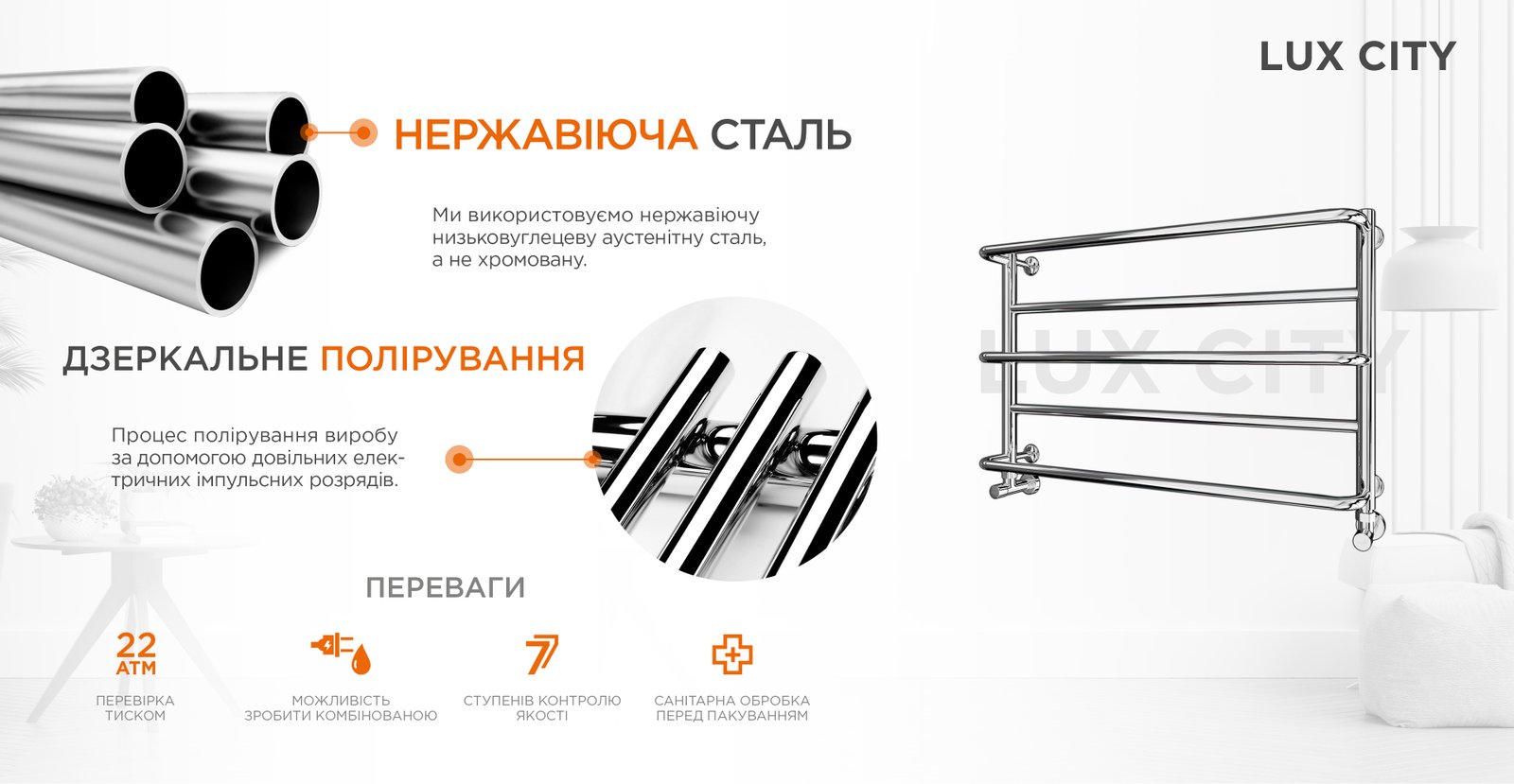 Виготовлена з полірованої нержавіючої сталі без хромування. Варіанти покриття: полірована або сатин, чорний мат, білий глянець, золото, бронза.