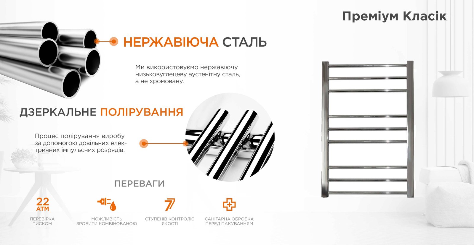 Виготовлена з полірованої нержавіючої сталі без хромування. Тип поверхні: полірована або сатин. Варіанти покриття: чорний мат, білий глянець, золото, бронза.