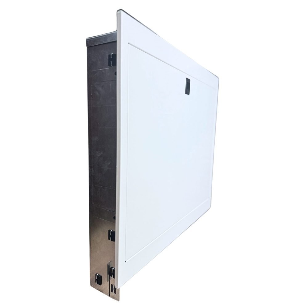 Надійна металева шафа для внутрішнього монтажу колекторів систем опалення та водопостачання. Виготовлена з оцинкованої сталі з білим порошковим покриттям — подвійний захист від корозії. Має перфорацію для зручного підведення труб, регульовані ніжки (575–675 мм) і висувну рамку з налаштуванням глибини (110–175 мм). Оснащена універсальними кріпленнями та продуманою системою монтажу. Доступна у двох варіантах: з замком-защіпкою або замком під ключ.