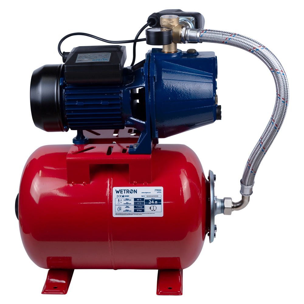 Станція 1.1кВт Hmax 50м Qmax 60л/хв (самовсмоктуючий насос) 24л Україна WETRON JET100А5 (775044/24) обладнана гідроакумулятором об'ємом 24 літра і керуючої автоматикою. Станція призначена для перекачування чистої води і може застосовуватися: для побутового водопостачання, допоміжного обладнання, підйому води в трубопроводах високого і низького тиску, для зрошувальних систем садів і городів, теплиць і парників. Установка устаткування повинна проводитися в місцях, захищених від атмосферного впливу і вологи. Гарантія 12 місяців.