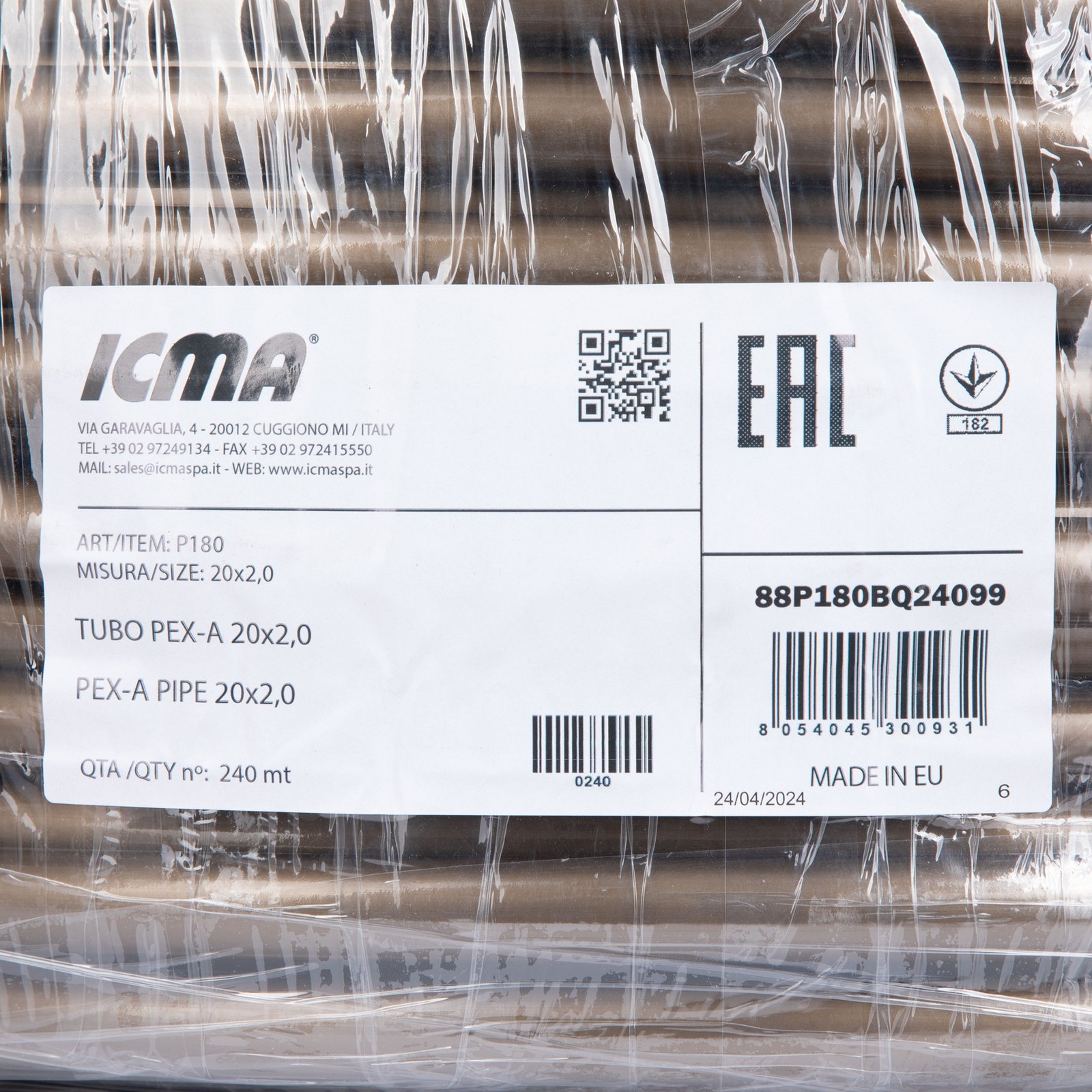 Гнучка та надійна труба Icma №P180 із зшитого поліетилену PE-Xa з тришаровим кисневим бар’єром EVOH (DIN 4726) забезпечує високу продуктивність, стійкість до корозії та хімічних речовин, придатна для питної води, сантехнічних систем, опалення, промислових трубопроводів і геотермальних установок; витримує температури від -40°C до +95°C, тиск до 8 бар, має гладку внутрішню поверхню, що зменшує відкладення та втрати тиску.