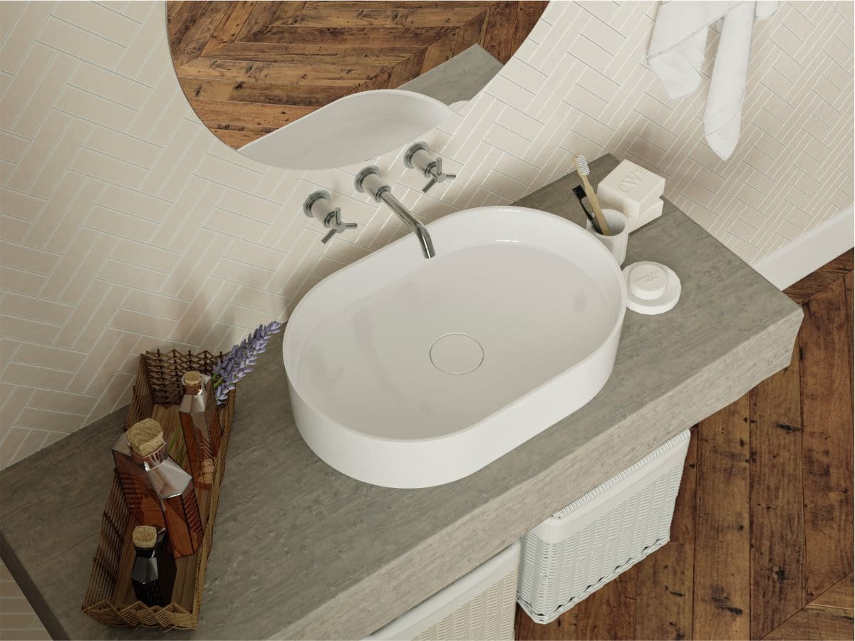 Овальний за формою чаші раковина має тип монтажу - накладний, врахуйте це перед замовленням меблів у ванну кімнату.