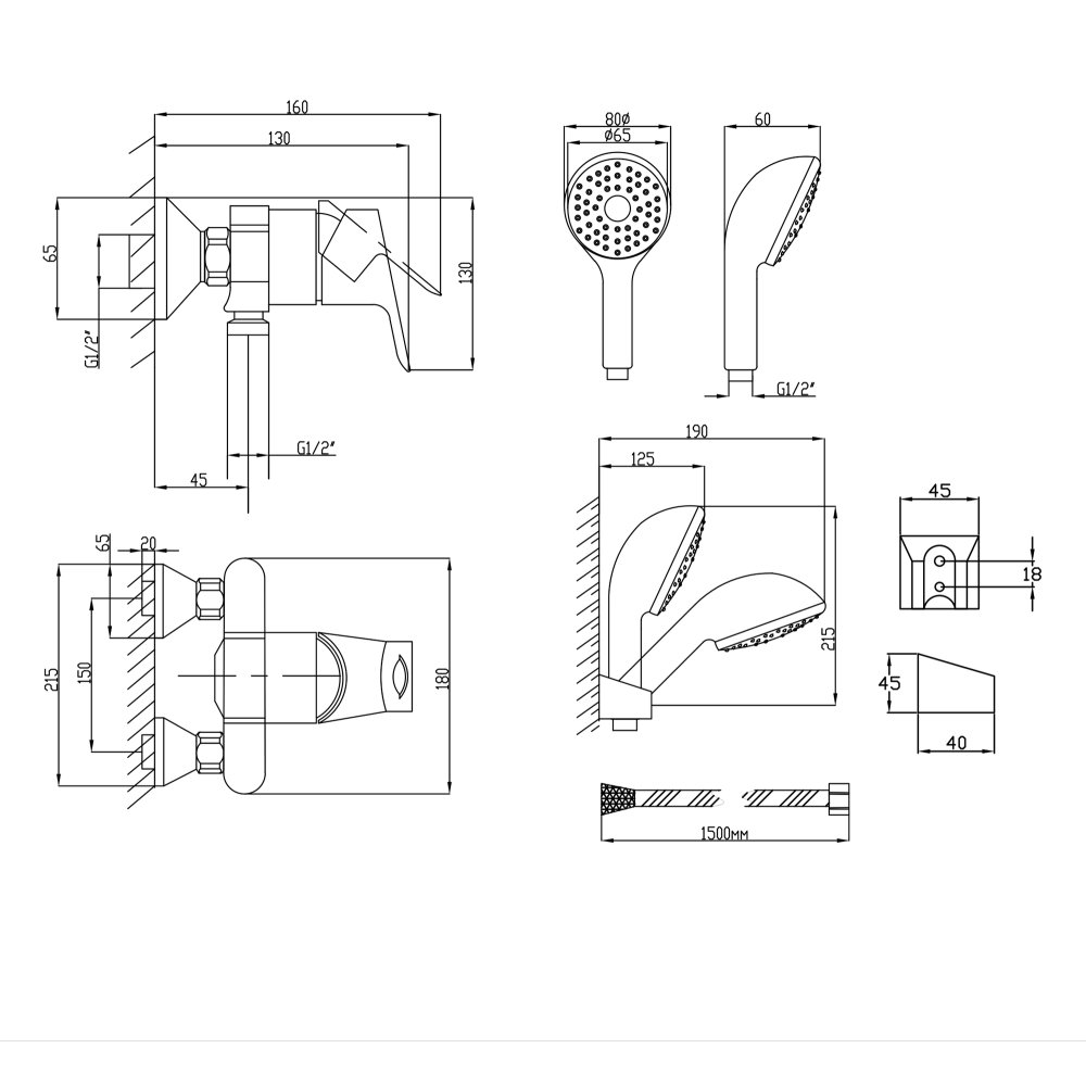 Змішувач, душовий шланг, лійка для ручного душу, кронштейн для ручного душу, кріплення.