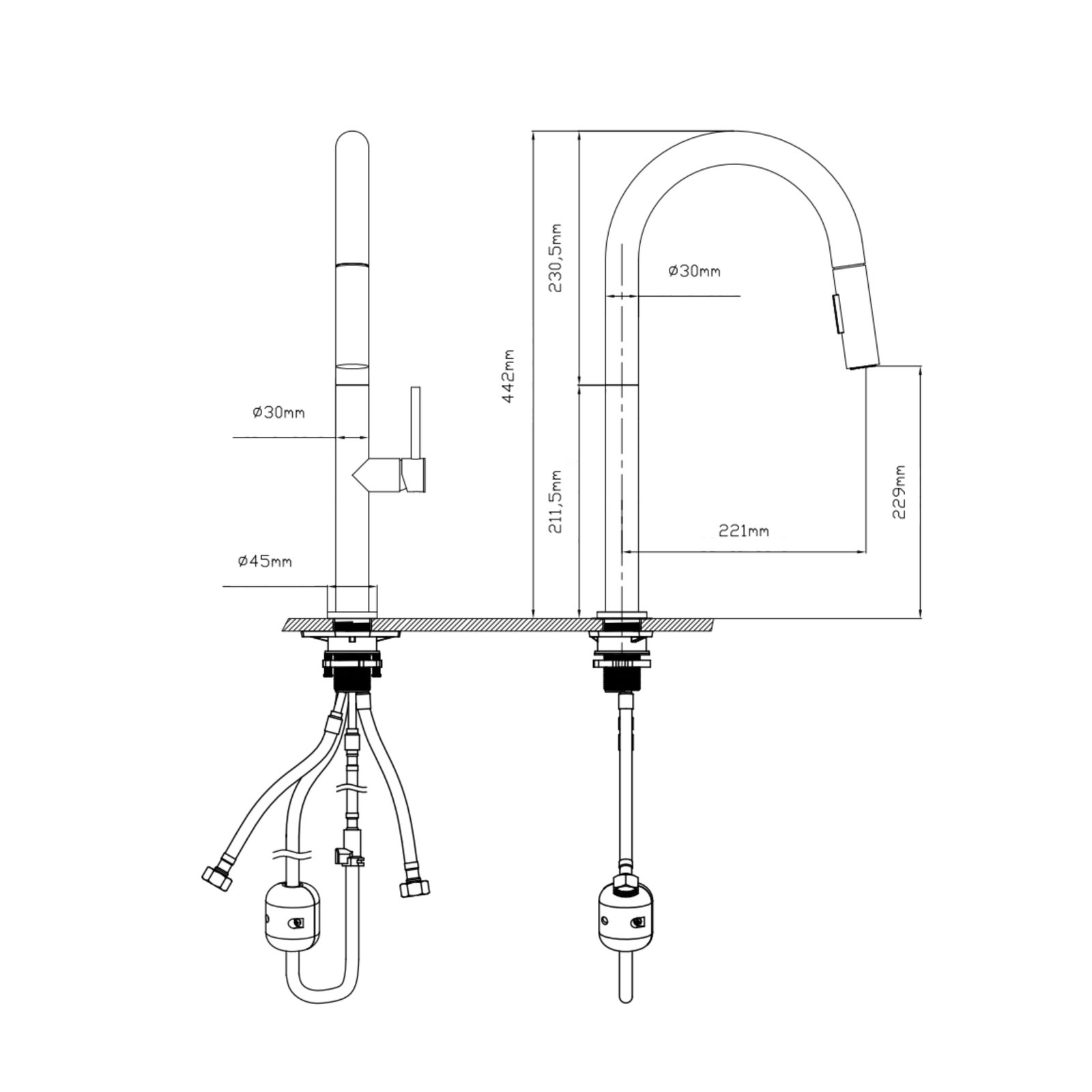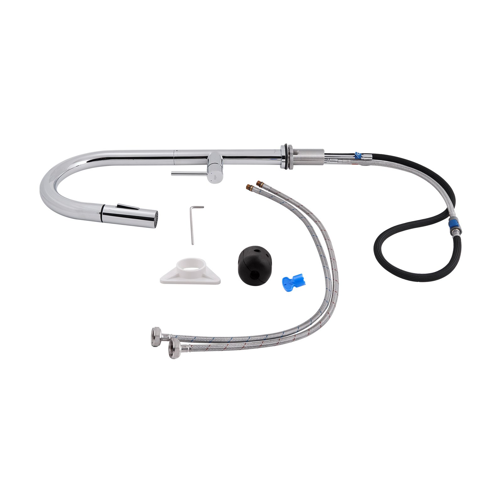 Змішувач, гнучкий підвід, шланг для висувної лійки, ключ для аератора, якір, кріпильні деталі.