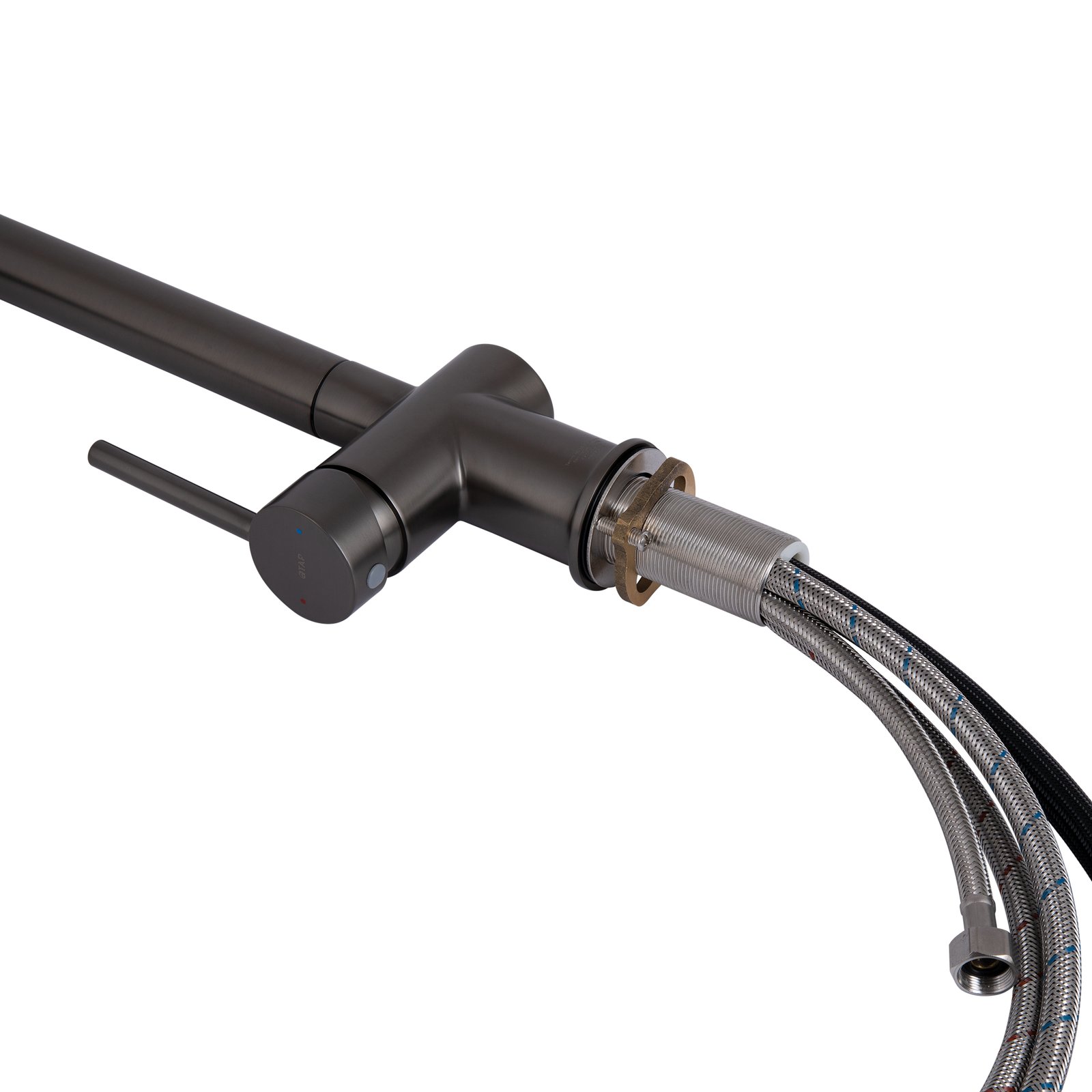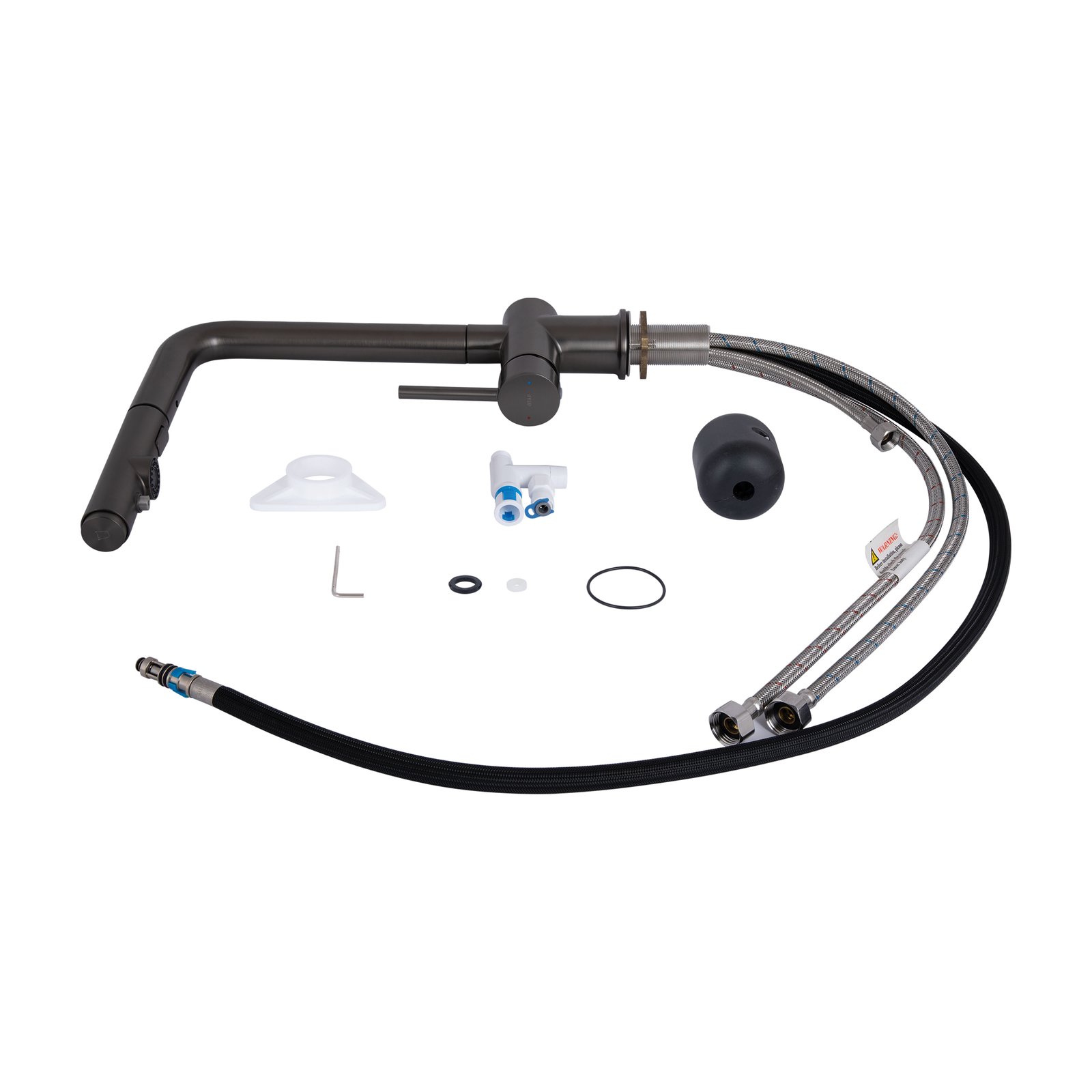 Змішувач, шланги підключення, шланг під фільтровану воду, деталі кріплення.