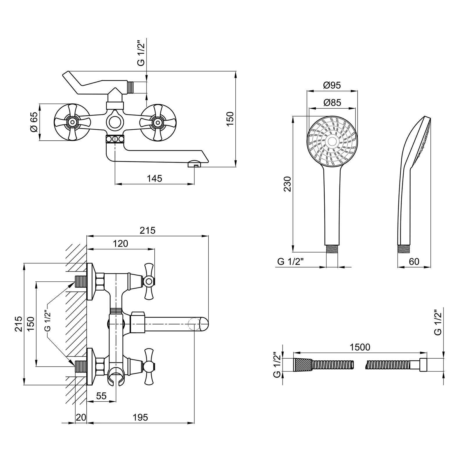 Змішувач, лійка для ручного душу, душовий шланг, кронштейн для ручного душу, кріплення.