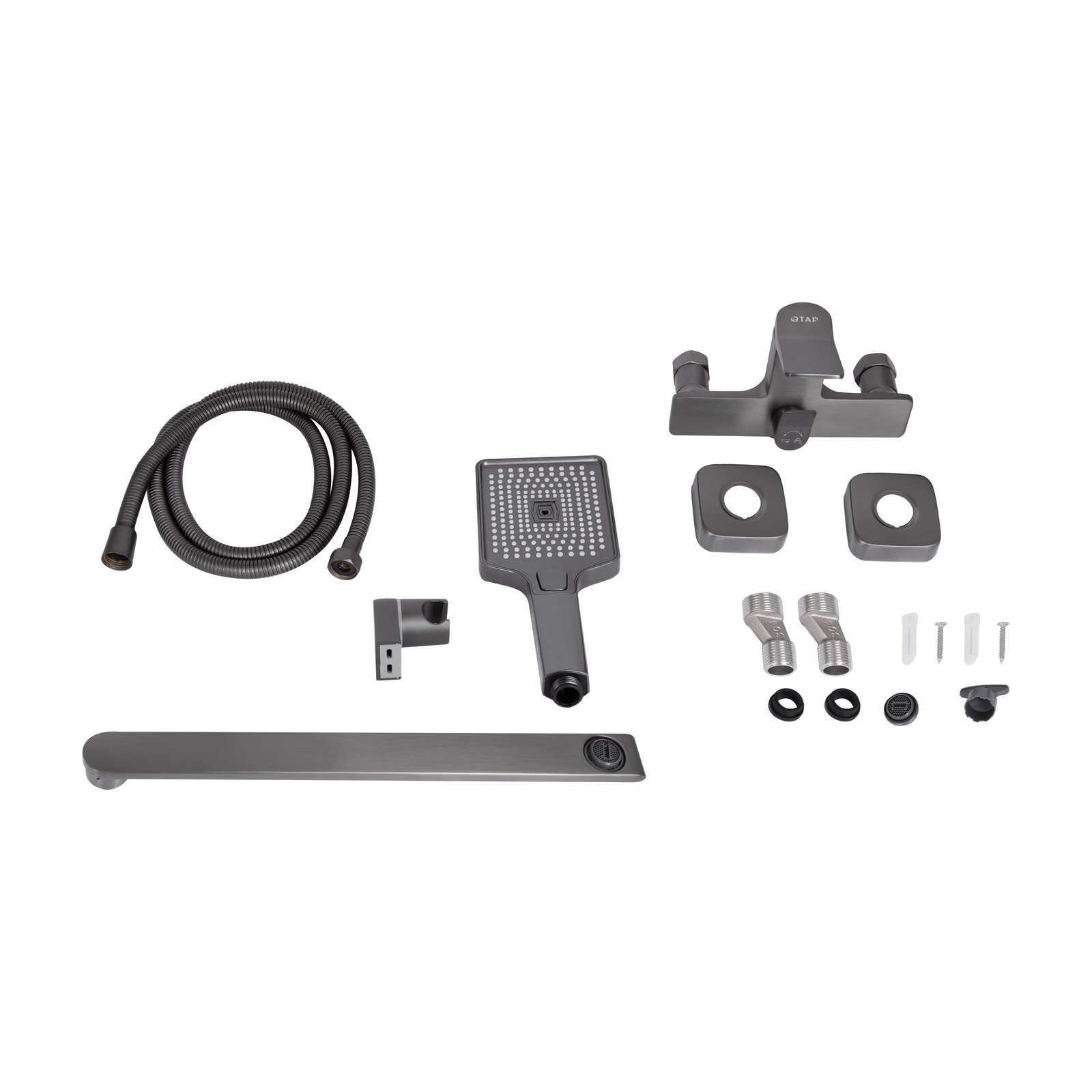 Змішувач, лійка для ручного душу, душовий шланг, кронштейн, деталі кріплення.