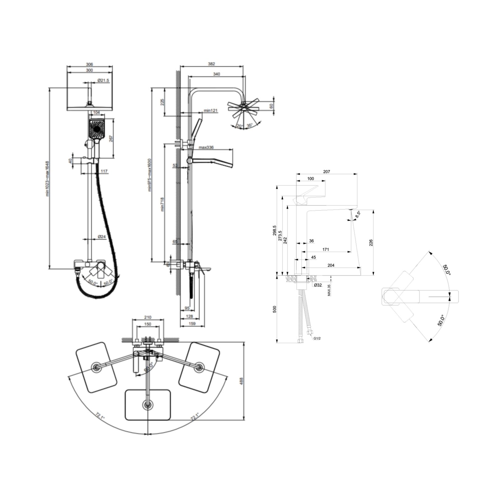 1,58 - змішувач для раковини: 5,2 - душова система