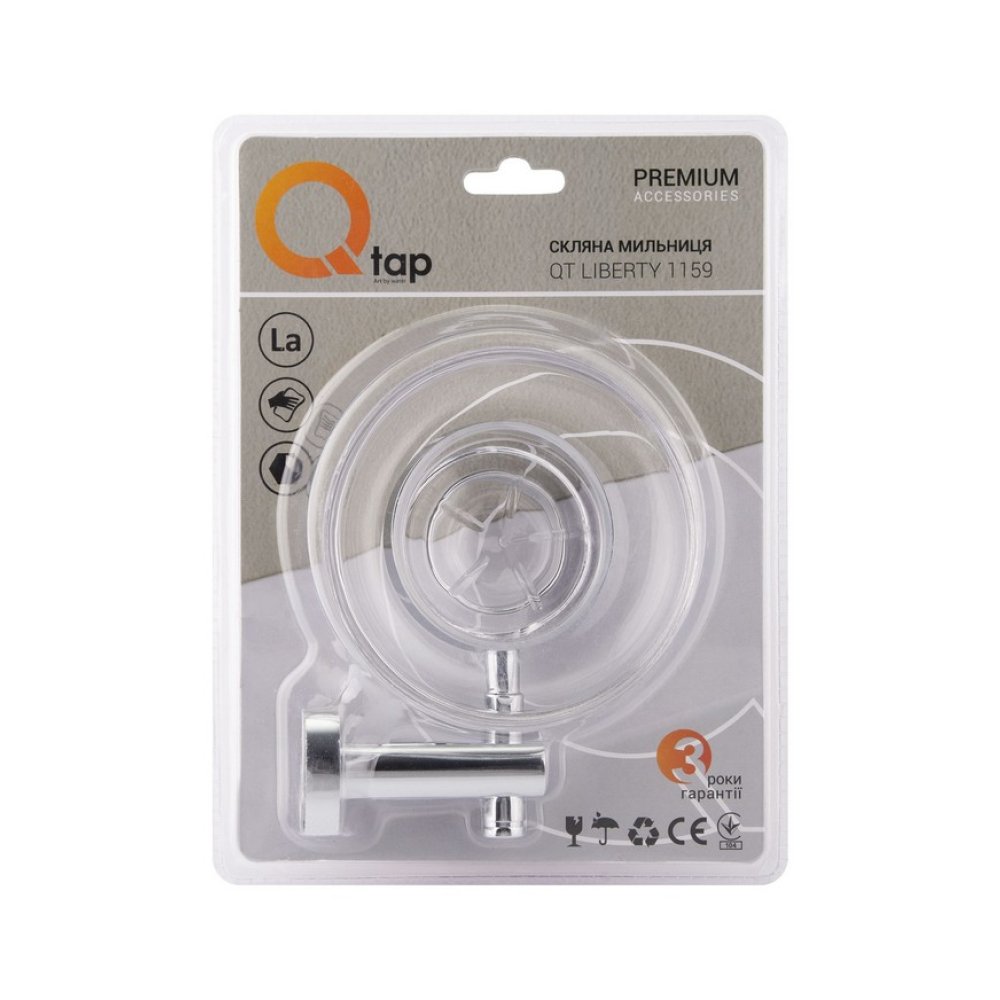 Мыльница Qtap Liberty CRM 1159 прочно крепится к стене, включает держатель и стеклянную чашу. Изделие не подвергается коррозии. Мыльница съемная, благодаря чему уход за ней будет простым и легким. В изделии используется уплотнительное кольцо (прокладка), необходимое для плотного соединения металла и стекла, также препятствующие возникновению шума в результате соприкосновения частей изделия. На держатель нанесен фирменный логотип компании.