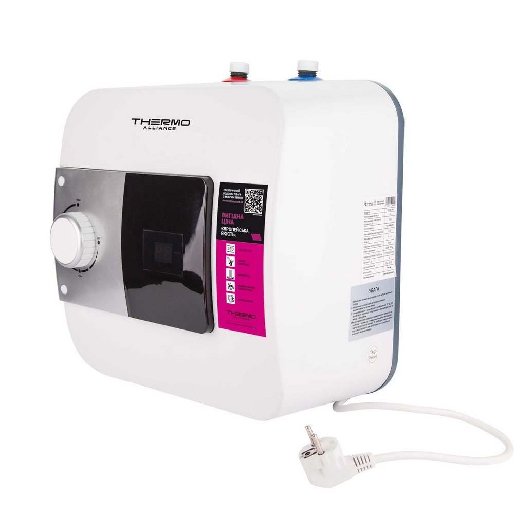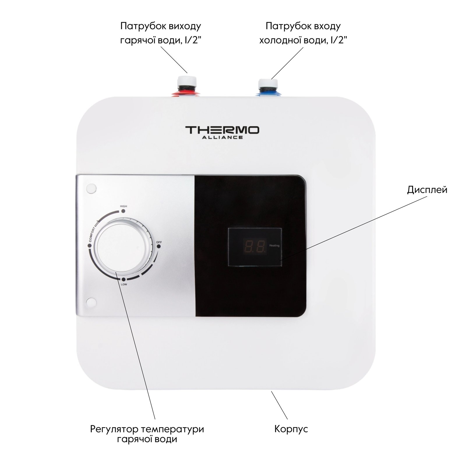 Водонагреватель Thermo Alliance 10 л под мойкой, мокрый ТЭН 1,5 кВт SF10S15N быстро нагреет небольшое количество воды. Такое накопительное устройство устанавливают в шкафчике под раковиной на кухне. Патрубки подключения размером 1/2" расположены в верхней части корпуса. Панель управления оснащена индикатором работы нагревательного элемента, дисплеем, показывающим температуру нагрева. Бак сделан из стали, эмалированное покрытием служит антикоррозионной защитой. Толщина внутреннего бака - 2 мм.