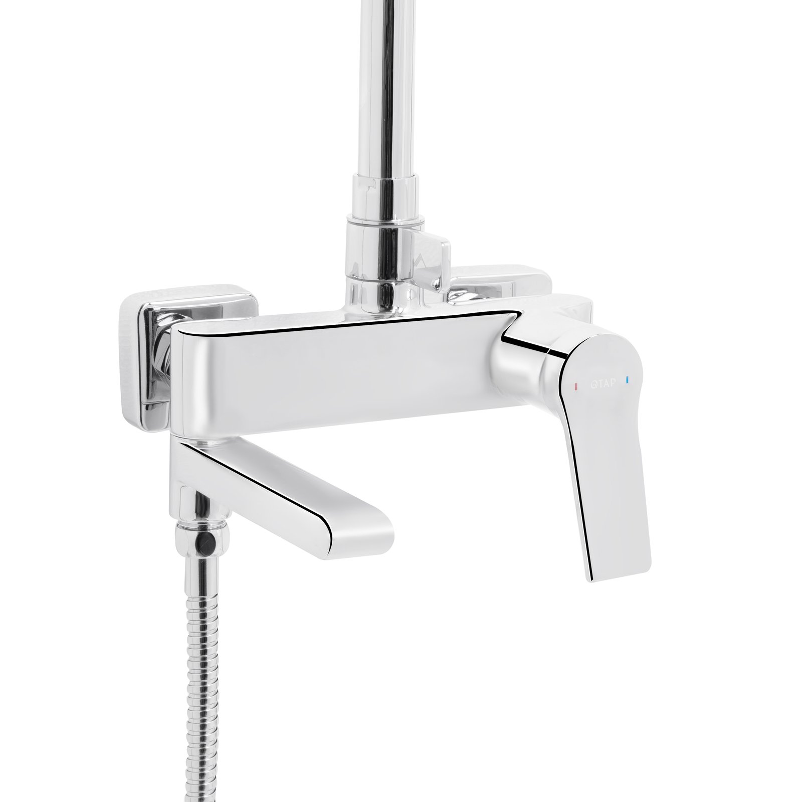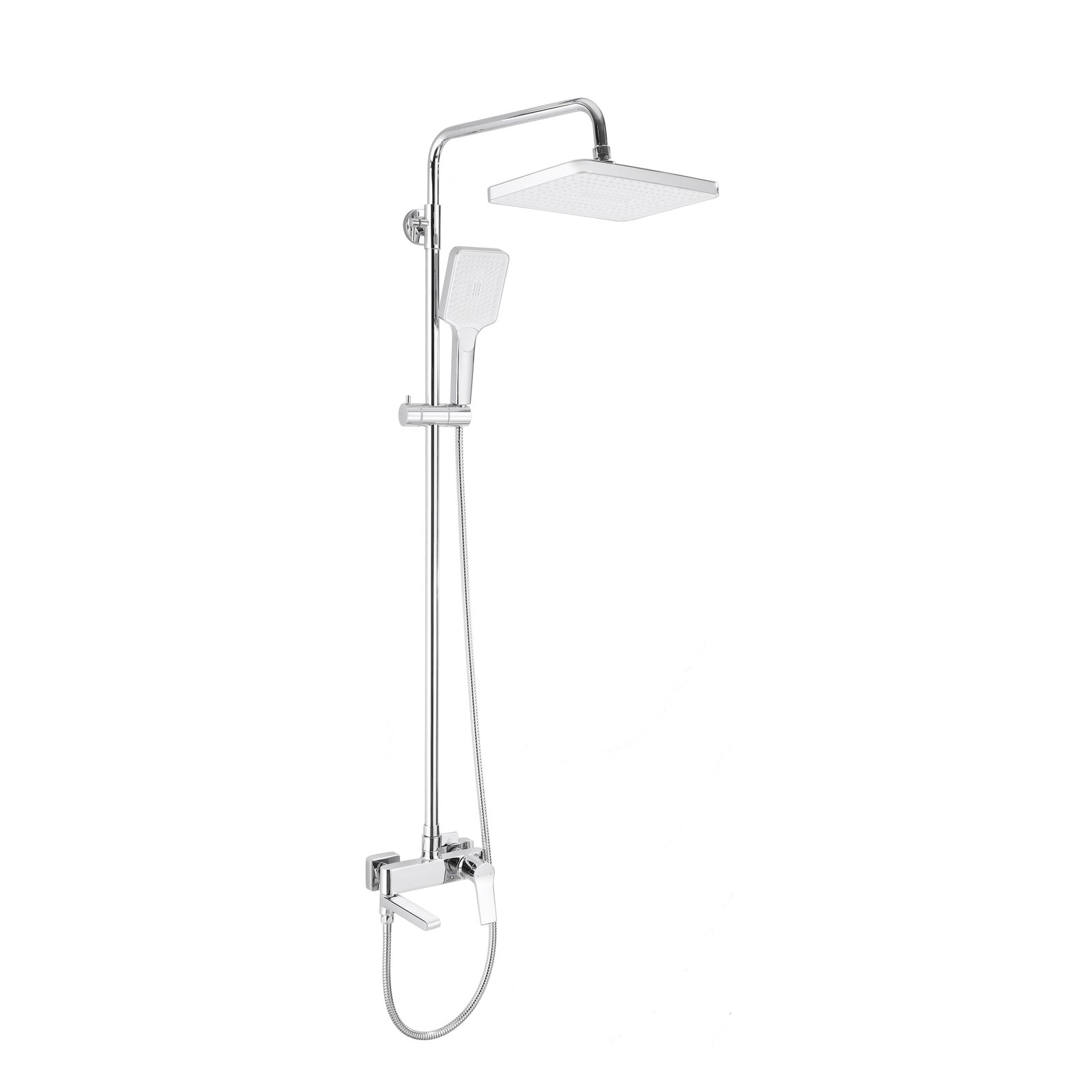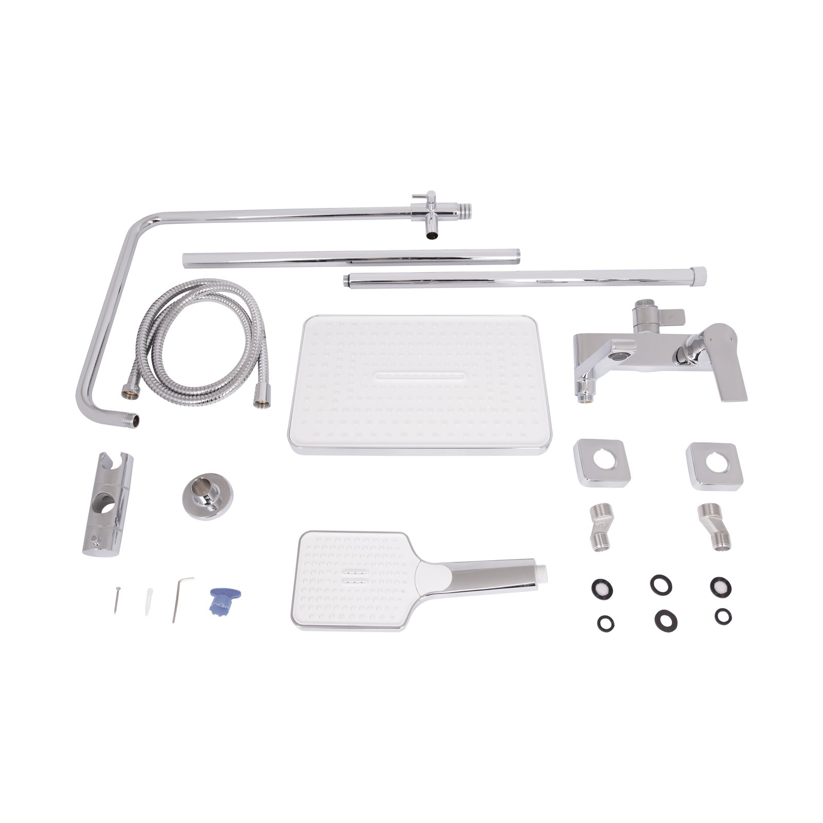 Настінний змішувач із перемикачем, верхній душ квадратної форми, ручна лійка, душовий шланг, штанга з регульованим тримачем для лійки, кріпильні елементи та ущільнювальні кільця.