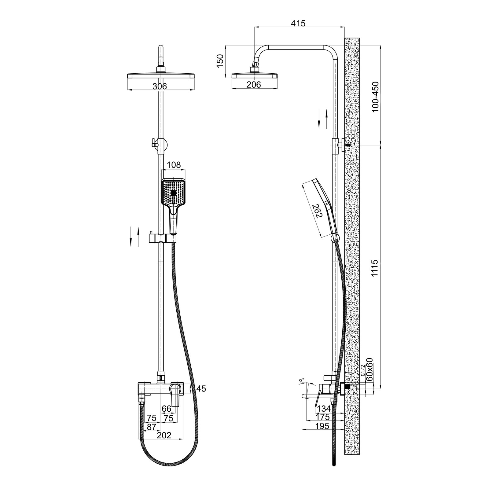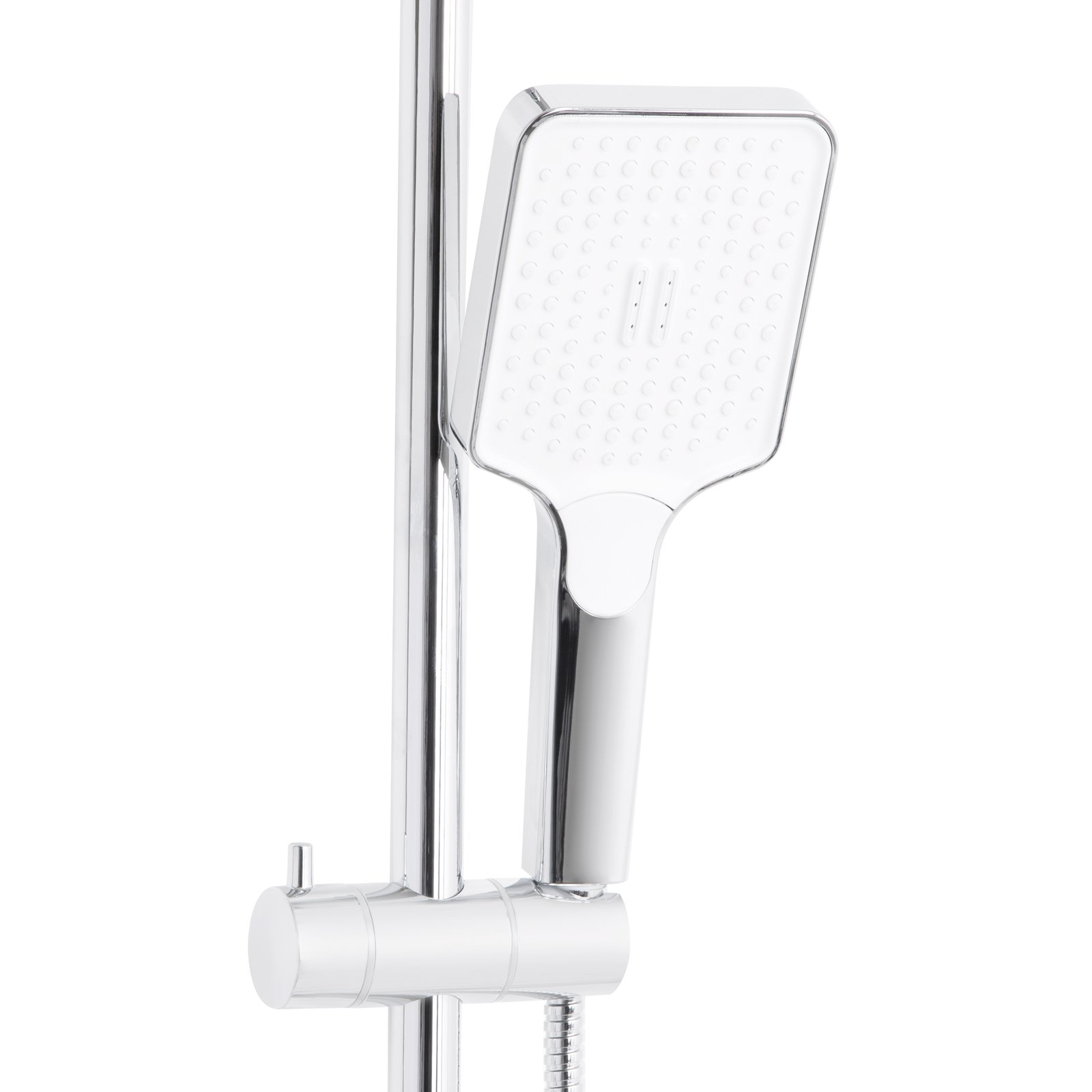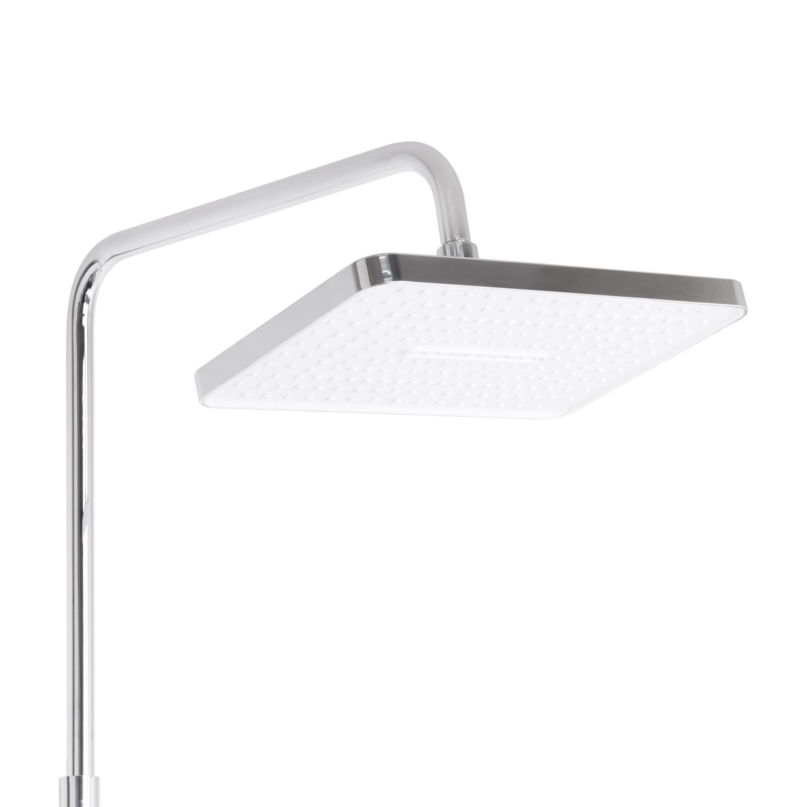 Настінний змішувач із перемикачем, верхній душ квадратної форми, ручна лійка, душовий шланг, штанга з регульованим тримачем для лійки, кріпильні елементи та ущільнювальні кільця.