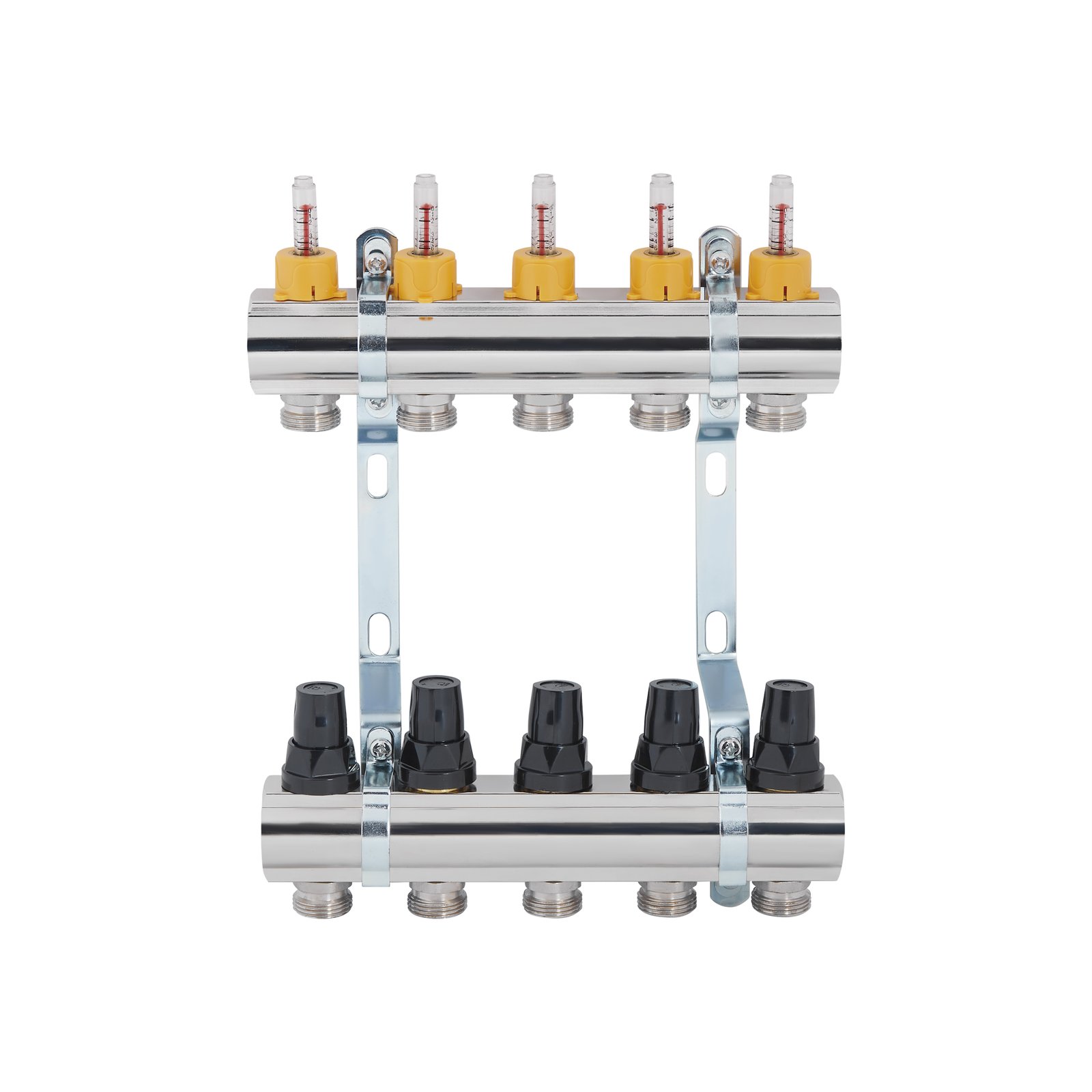 Коллектор с расходомерами SD Forte 1" на 5 выходов удобно крепить к стене или в коллекторном шкафу на двух специальных кронштейнах, которые входят в комплектацию. Назначение этого коллектора — управление распределением жидкого носителя в петлях системы «теплый пол». На подающей линии расположены расходомеры, на обратной —термостатические клапаны. Изделие рассчитано на эксплуатацию при максимальном рабочем давление 4 бара. Температурный показатель теплоносителя на входе в устройство — max. 95 °C.