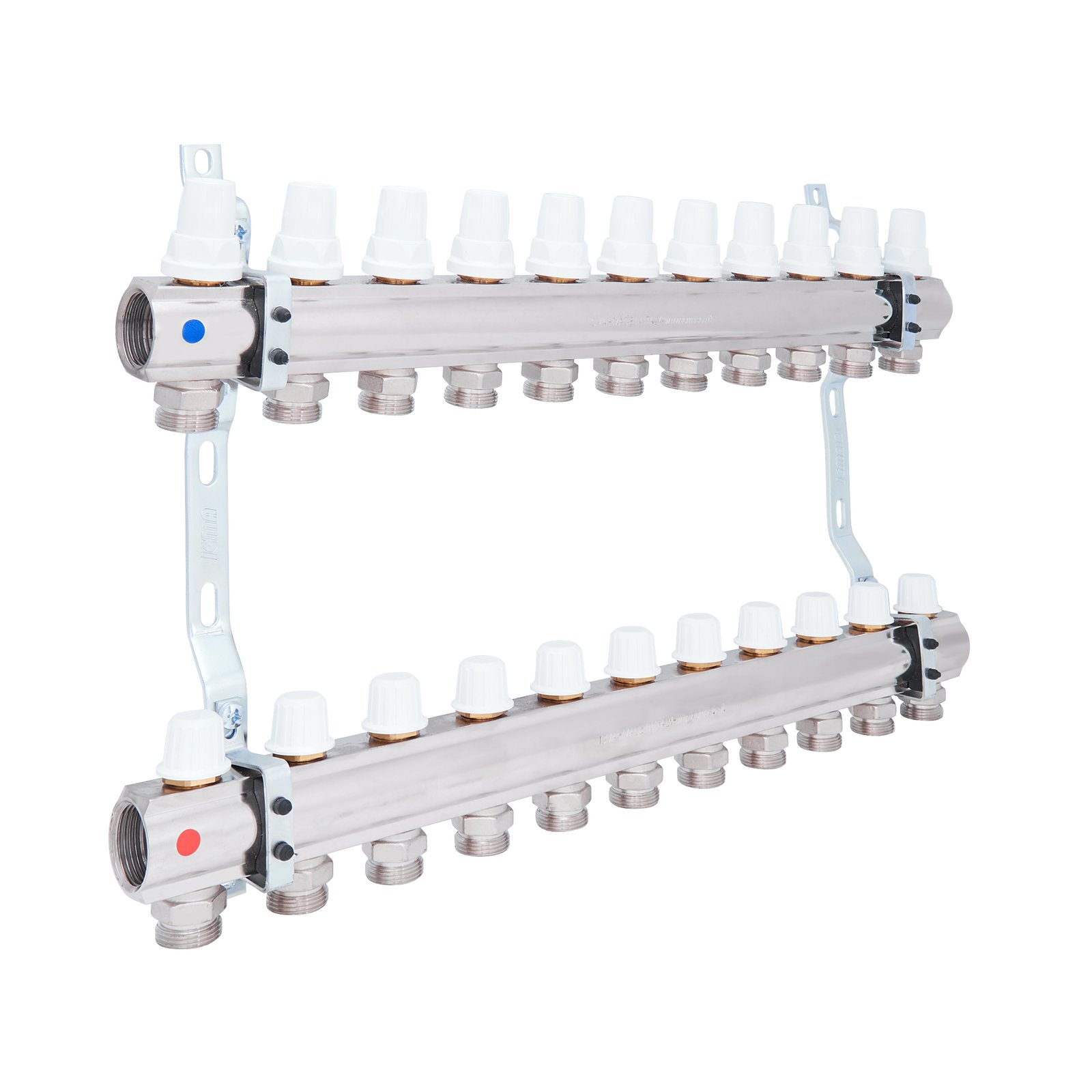 Коллектор ICMA Арт. K005 с запорными кранами с микрометрической регулировкой предназначен для распределения тепловой энергии в системе отопления. Данная установка применяется в системах радиаторного отопления. Регулировка расхода сетевой воды по контурам – ручная или терморегулирующая. Запорные краны с микрометрической регулировкой позволяют перекрывать подачу воды и регулировать расход сетевой воды в каждом контуре отопления. Коллектор имеет 11 выходов.