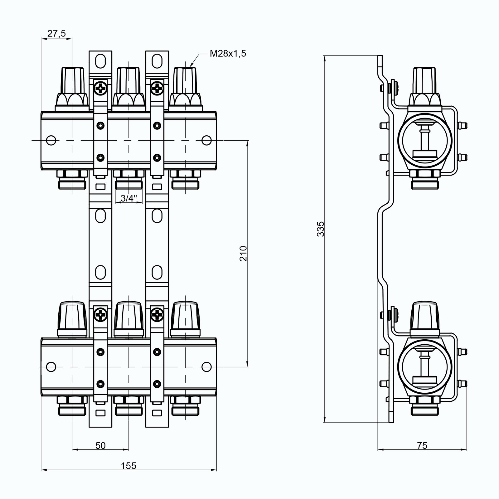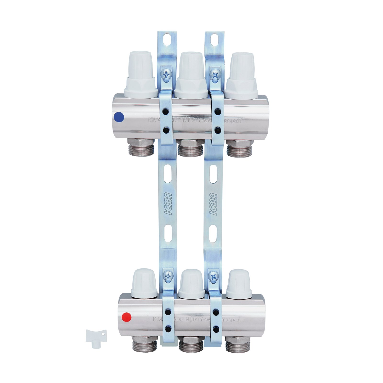 Коллектор ICMA Арт. K005 с запорными кранами с микрометрической регулировкой предназначен для распределения тепловой энергии в системе отопления. Данная установка применяется в системах радиаторного отопления. Регулировка расхода сетевой воды по контурам – ручная или терморегулирующая. Запорные краны с микрометрической регулировкой позволяют перекрывать подачу воды и регулировать расход сетевой воды в каждом контуре отопления. Коллектор имеет 3 выхода.