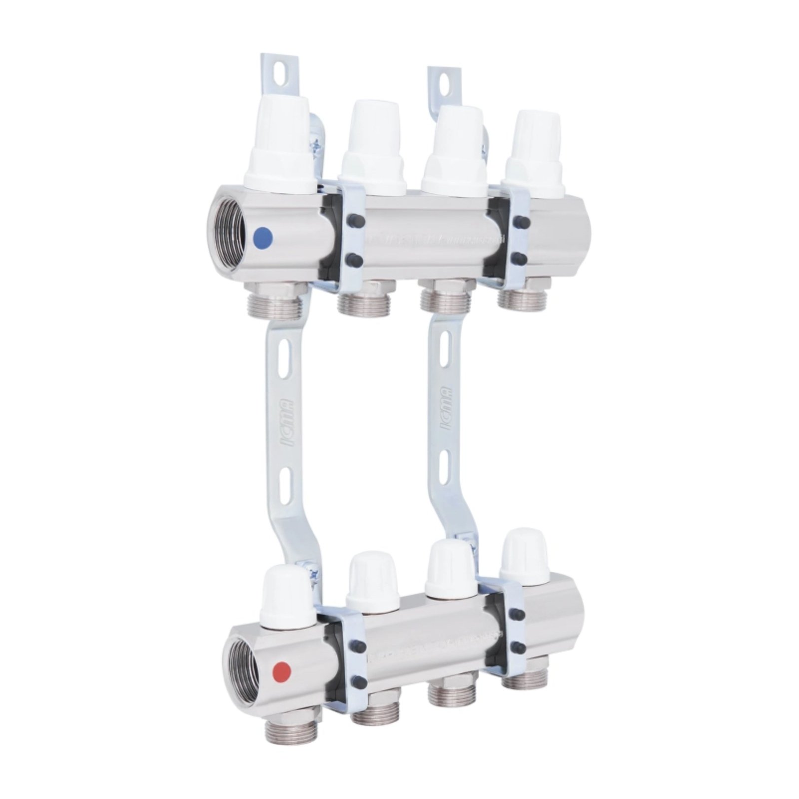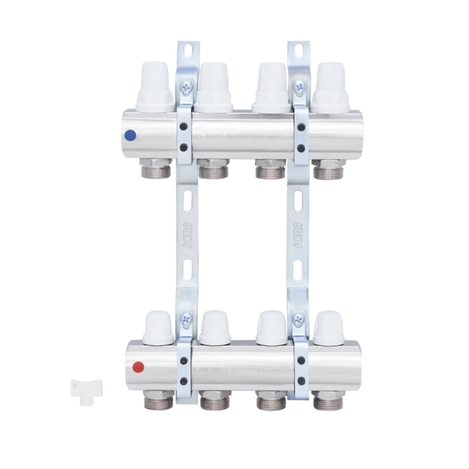 Коллектор ICMA Арт. K005 с запорными кранами с микрометрической регулировкой предназначен для распределения тепловой энергии в системе отопления. Данная установка применяется в системах радиаторного отопления. Регулировка расхода сетевой воды по контурам – ручная или терморегулирующая. Запорные краны с микрометрической регулировкой позволяют перекрывать подачу воды и регулировать расход сетевой воды в каждом контуре отопления. Коллектор имеет 4 выхода.
