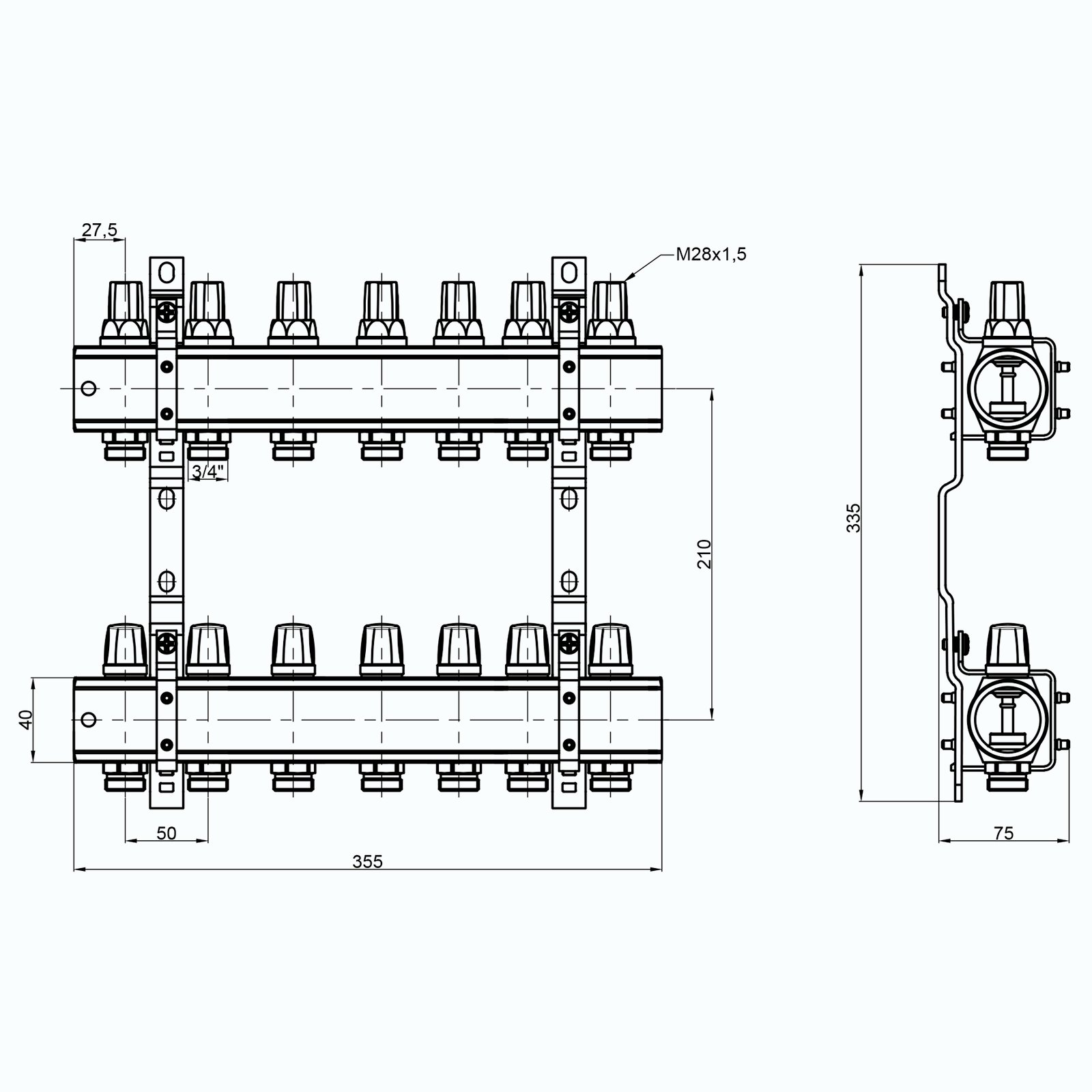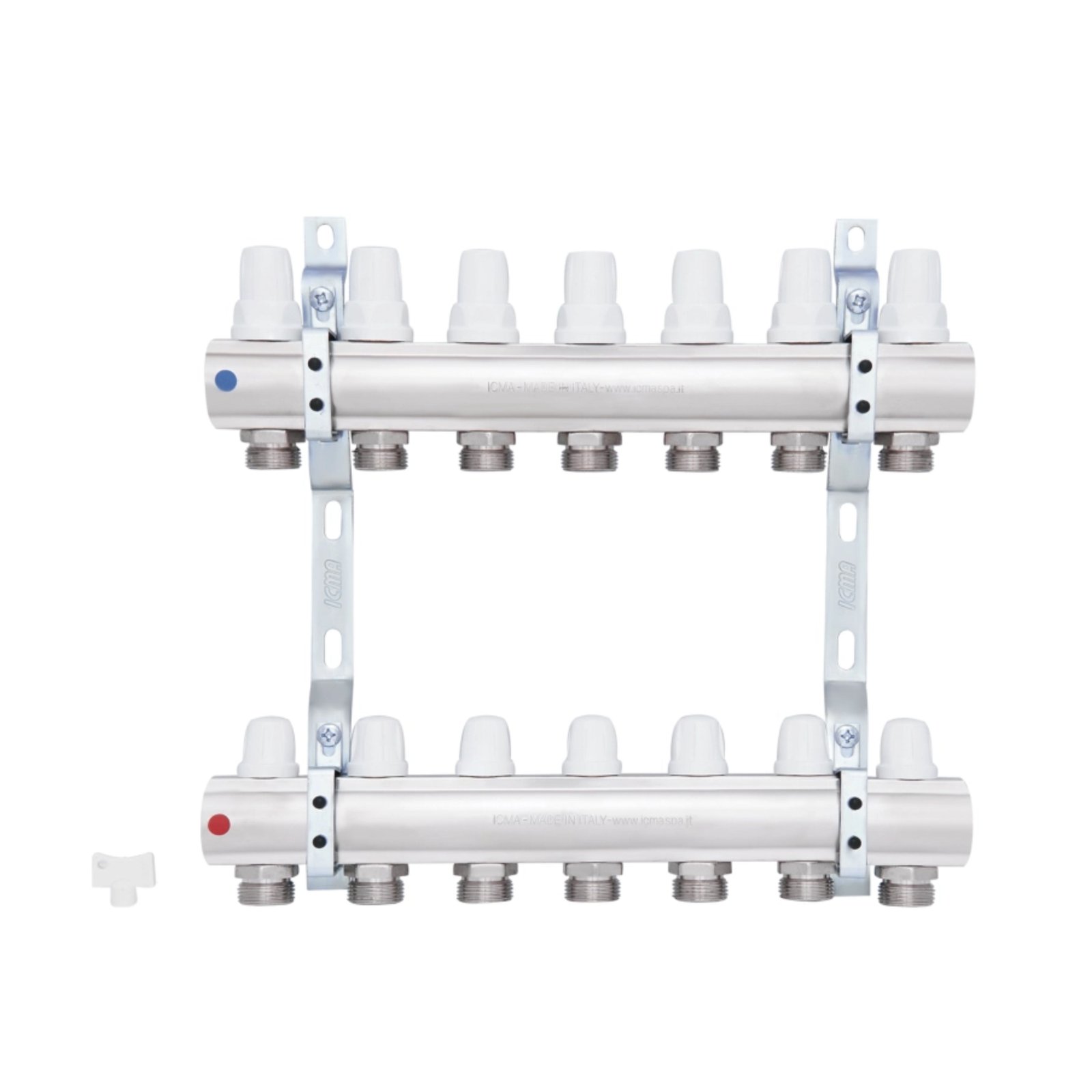 Коллектор ICMA Арт. K005 с запорными кранами с микрометрической регулировкой предназначен для распределения тепловой энергии в системе отопления. Данная установка применяется в системах радиаторного отопления. Регулировка расхода сетевой воды по контурам – ручная или терморегулирующая. Запорные краны с микрометрической регулировкой позволяют перекрывать подачу воды и регулировать расход сетевой воды в каждом контуре отопления. Коллектор имеет 7 выходов.