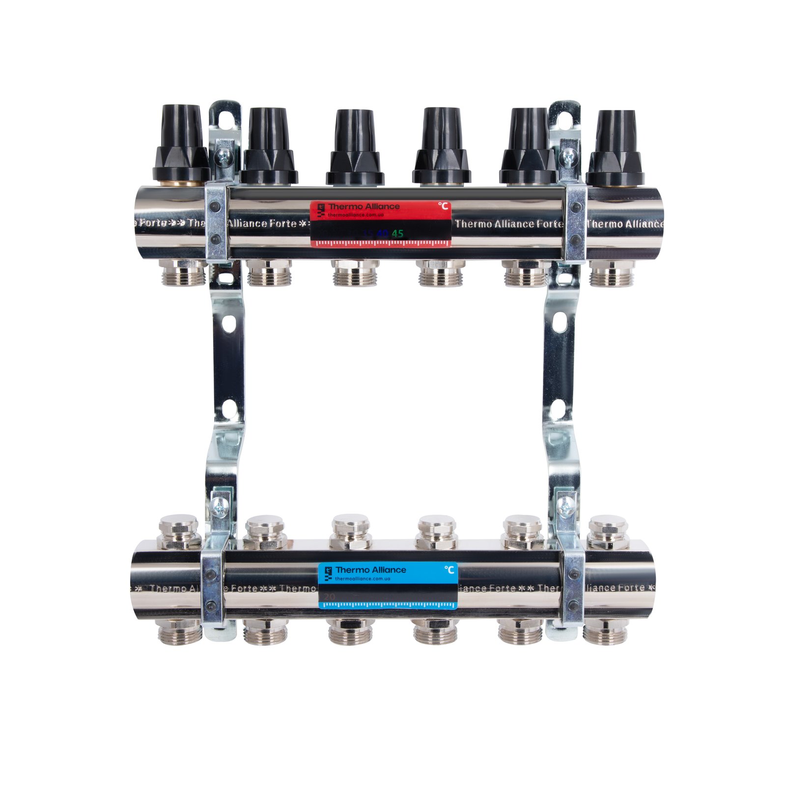 Комплект наклеек с термометром Thermo Alliance Standart предназначен для визуального контроля температуры на коллекторе отопления. В набор входят две самоклеящиеся термополосы — красная и синяя — с температурной шкалой от 20 °C до 60 °C. Наклейки позволяют быстро определить температуру подающего и обратного контуров, обеспечивая удобный и наглядный мониторинг системы. Благодаря качественному клеевому слою и стойким материалам они надежно фиксируются на поверхности и сохраняют точность показаний в процессе эксплуатации.