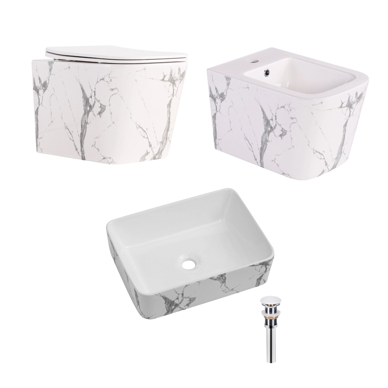 Комплект Tern Marble – выбор для интерьеров с акцентом на естественную текстуру. Подвесной унитаз Ultra Quiet, биде и накладная раковина гармонично сочетаются в дизайне и цвете. Рисунок мрамора создает эффект изысканной поверхности и подчеркивает статус пространства.