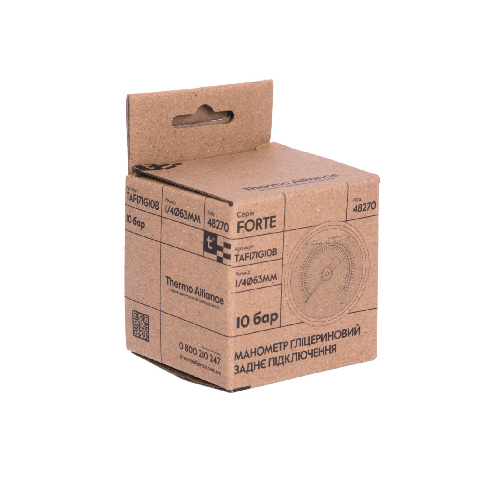 Thermo Alliance Forte TAF171G10B — глицериновый манометр с корпусом диаметром 63 мм и латунным подключением 1/4" Н с задним присоединением. Предназначен для измерения давления до 10 бар в водяных, воздушных и других технических системах. Заполнение глицерином снижает вибрацию стрелки и продлевает срок службы прибора.